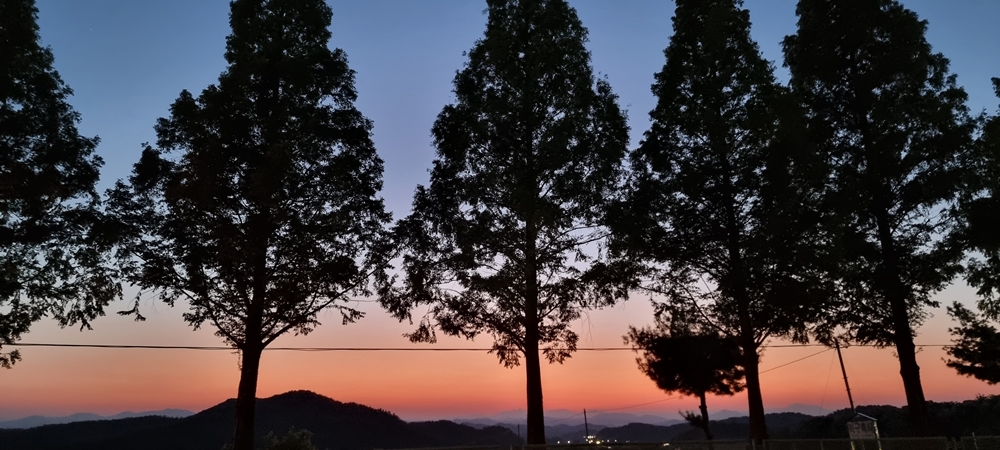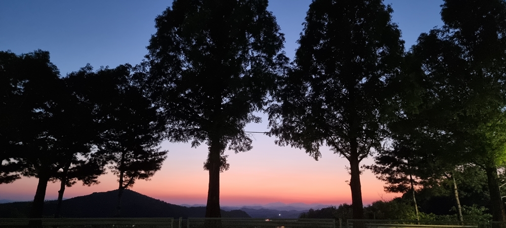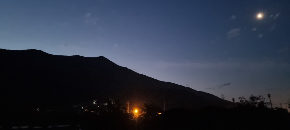광려산 방향으로 부터 먼동이 터 오는데 며칠간 함께 했던 달은 배가 많이 홀쭉해져 있고