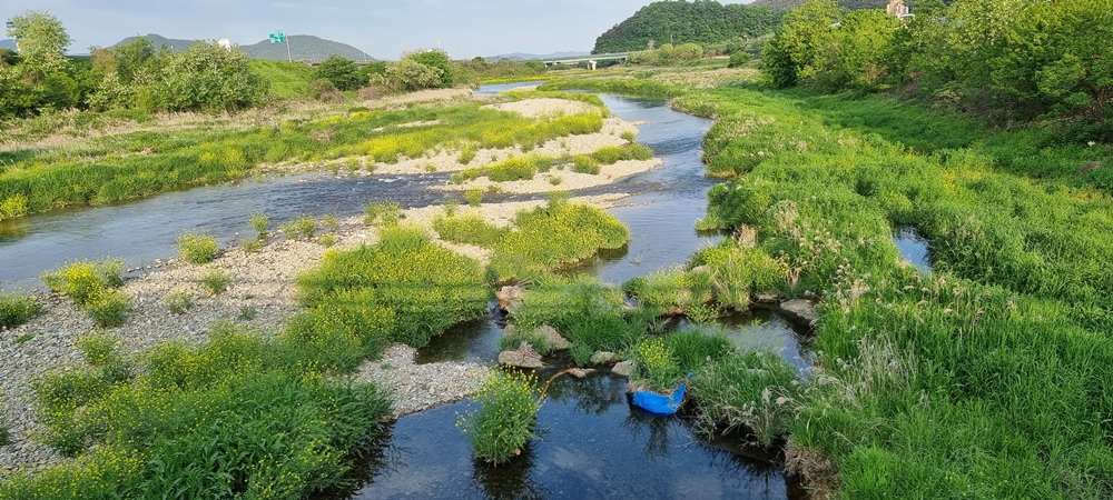 창녕 화왕산에서 흘러온 계성천을 건너는데 물은 거의 간장과 된장을 적당한 비율로 썩어 휘졌어 놓은 듯하다.