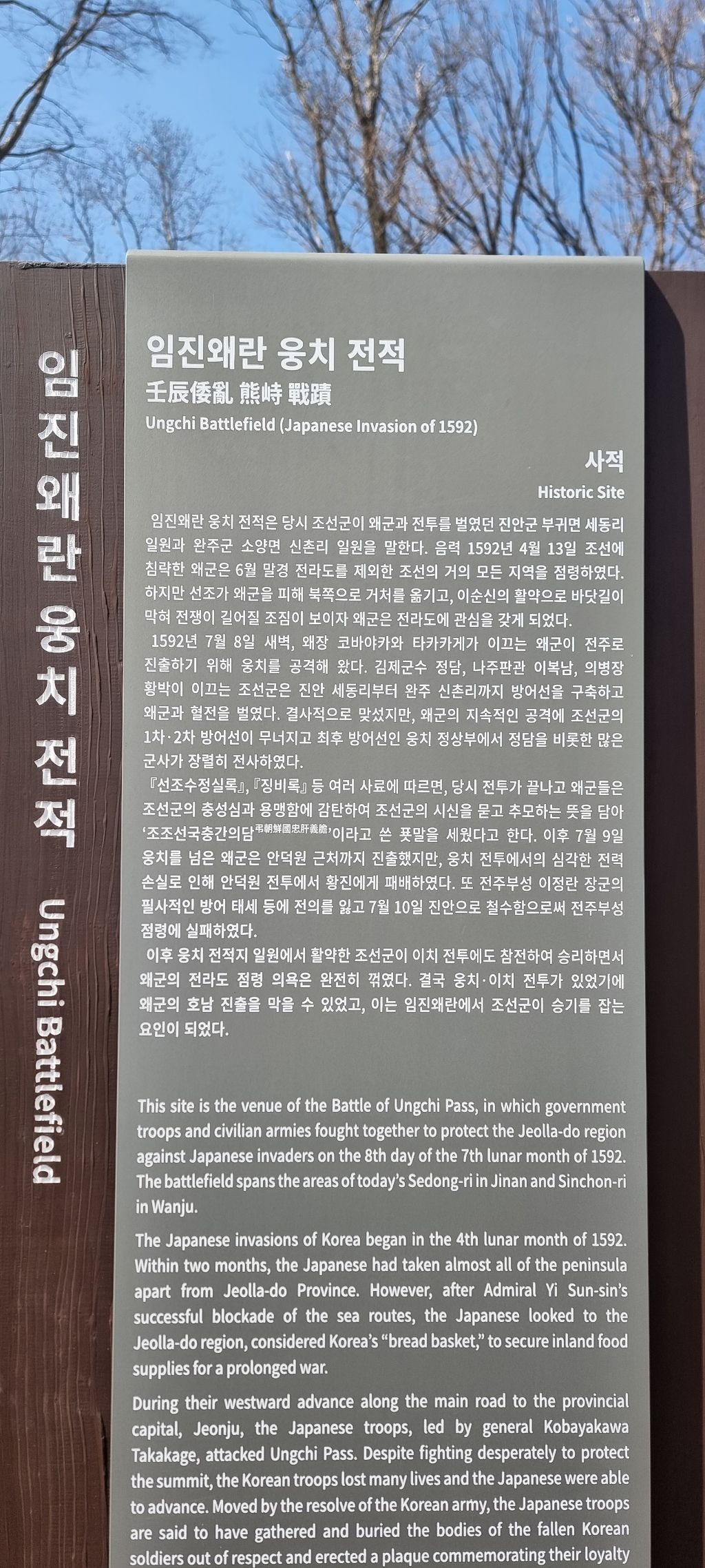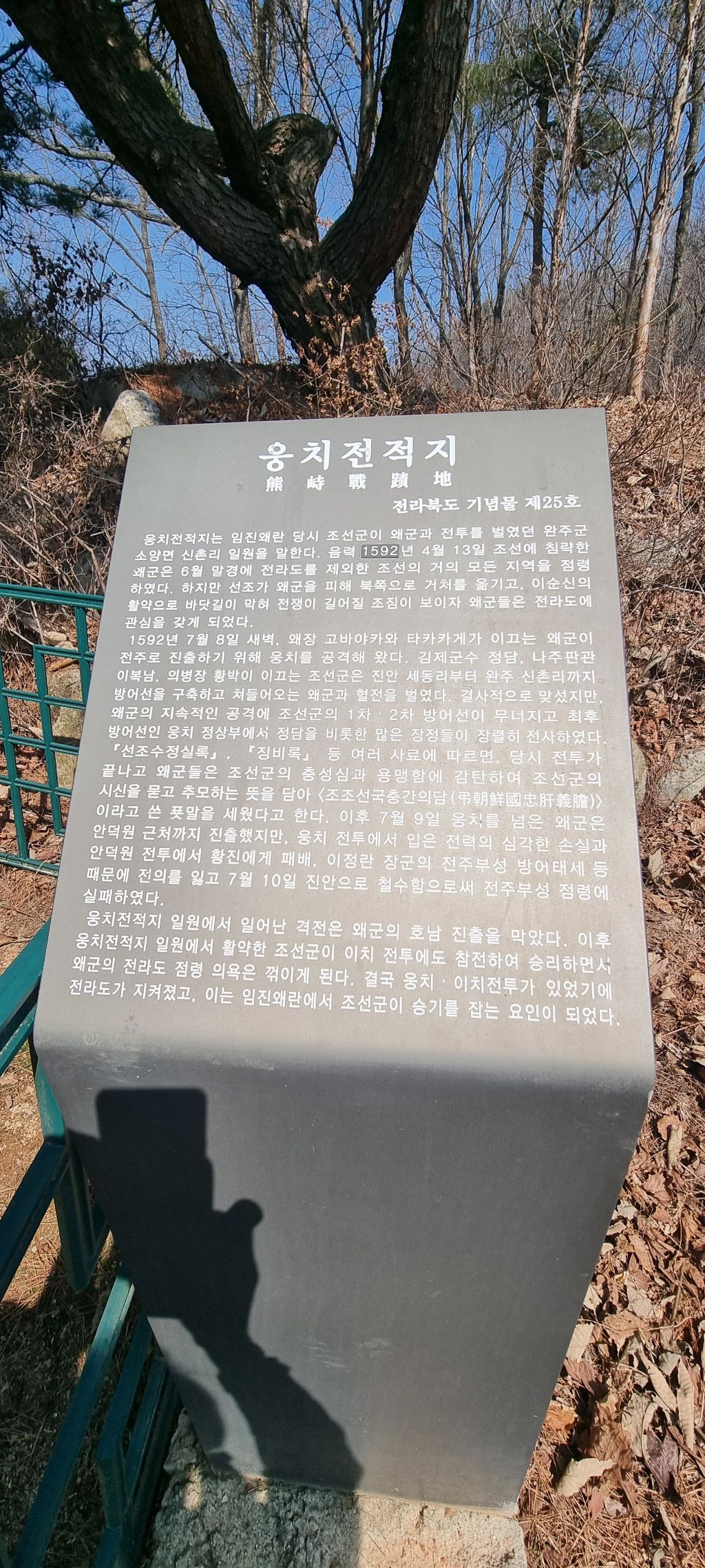 실제 김제군수 정담장군이나 의병장 황박이 지키고 싸웠던 현장이 곰티재가 아니라 북쪽 산길 따라 2KM 정도 더 가야 웅치고개인데 전적비가 세워진 년도가 2012년도 무렵이라고 하니 웅치고개로 잘못 알고 전적비를 세웠거나 아니면 웅치고개에 세울 자리가 없어 곰티재에 세웠는지 알길 없다