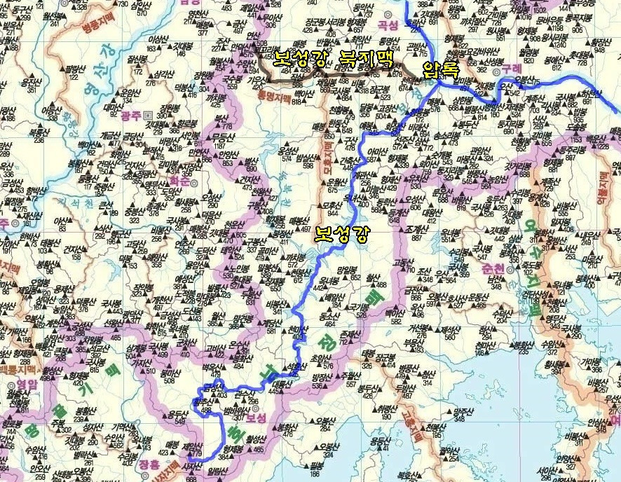 제암산을 모두 보성강 발원지로 보고 그중에서 가장 긴 빗물꼭짓점 코스를 찾으니 제암산 정상에서 서남쪽으로 이어지는 계곡이 가장 길다.