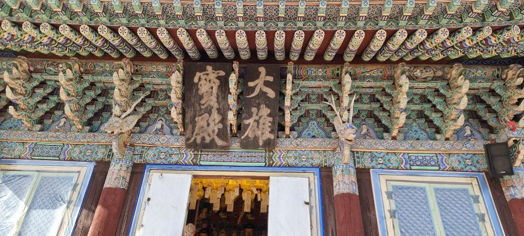 대웅보전에 들러 부처님께 절하고 나와 현판글은 추사와 쌍벽을 이루던 원교 이광사 선생이 쓴 글로써 대웅보전, 바로 앞의 만경루 , 명부전 글 3점이 있다.
