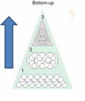 자료에 의한 정보처리 과정으로, 자극에 대한 기본적인 요소나 특징과 같은 낮은 차원의 세부 단위(vocabulary/ grammar/ sounds)를 분석한 후에 더 높은 차원의 단위(general knowledge/ life experience/ knowledge of situational routines/ language function)로 구성하는 인간의 정보처리 방식.