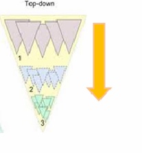 높은 차원의 일반지식(general knowledge/ life experience/ knowledge of situational routines/ language function)이 낮은 차원의 작은 지각단위들(vocabulary/ grammar/ sounds)을 해석할 때 작용되는 인간의 정보처리 방식.