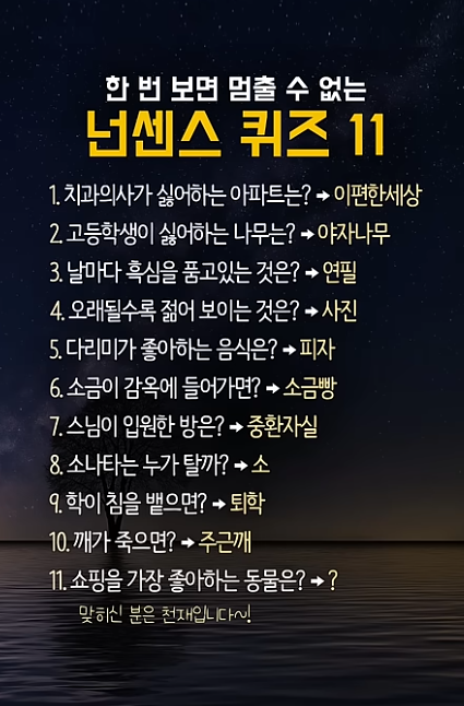넌센스 퀴즈 11 작성자가온누리|작성시간25.11.21|조회수31 목록 댓글 5 글자크기 작게가 글자크기 크게가 다음검색 현재 게시글 추가 기능 열기 북마크 공유하기 신고 센터로 신고 댓글 댓글 5 댓글쓰기 답글쓰기 댓글 리스트 작성자소베로니카 | 작성시간 25.11.22 쇼핑을 좋아하는 ᆢ강남 친구~ 작성자가을리 | 작성시간 25.11.22 잼있네요 ㅋ 작성자엘리야 | 작성시간 25.11.29 중환자실이 제일 웃깁니다 작성자세아 | 작성시간 25.12.07 11 번 답이 뭘까요~ 작성자즐거운참치 | 작성시간 25.12.13 사자? 댓글 전체보기