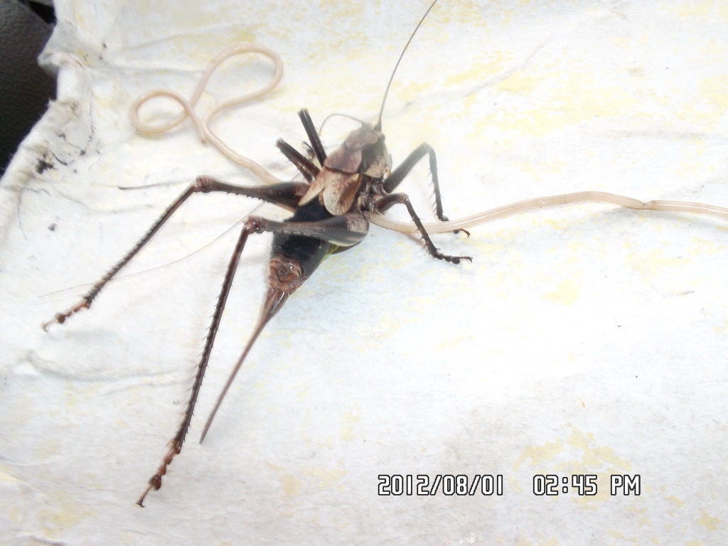 사진-갈색여치 몸에서 빠져나온 연가시류. 갈색여치의 옆구리를 찢고 나왔으며 갈색여치는 얼마 뒤 사망했다.