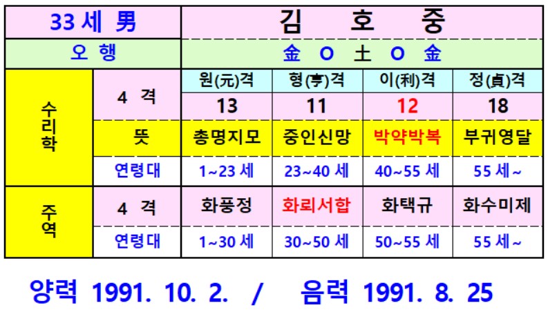 그의 사주도 위 이미지와 아주 유사한데 한자이름은 기가 막히게 잘 지어졌기 때문에