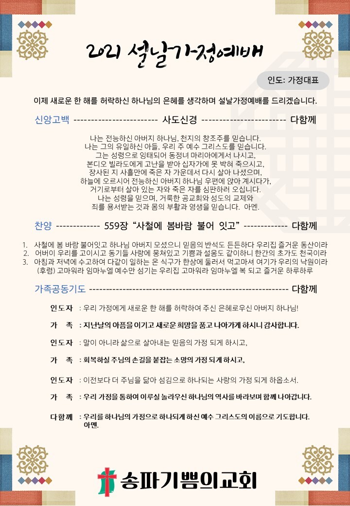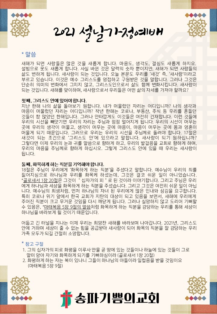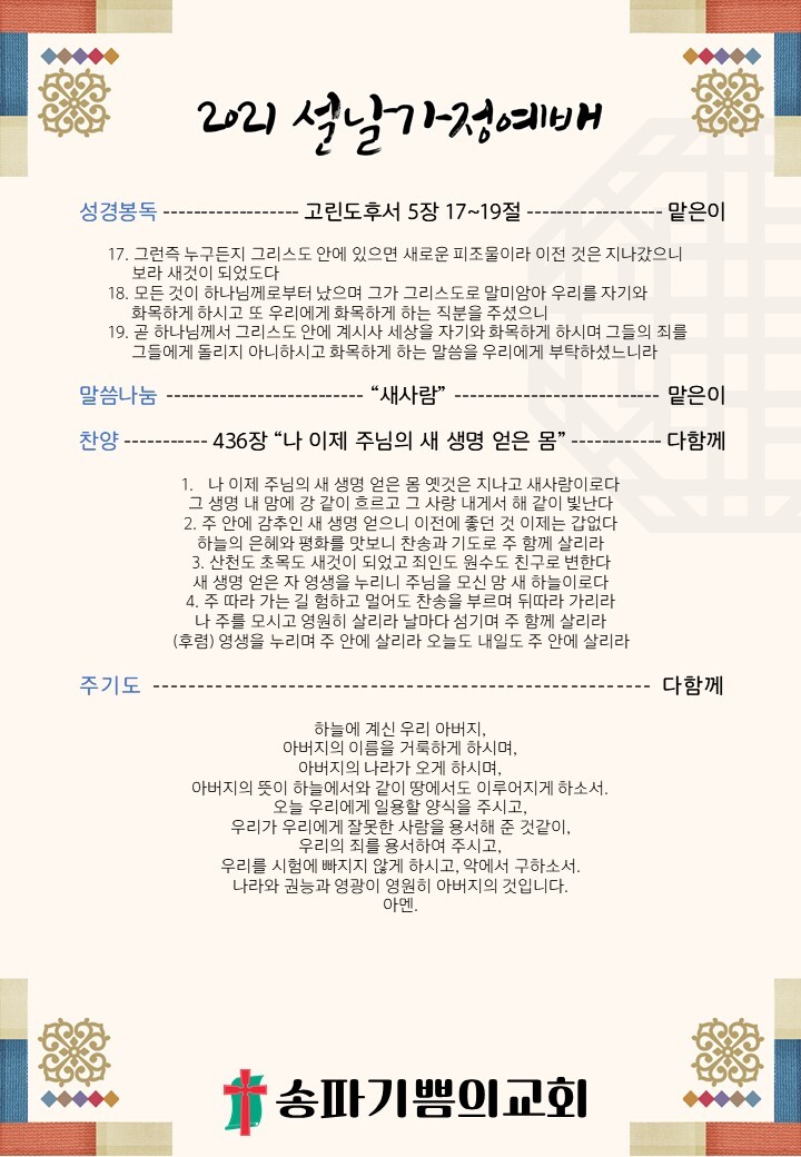 21/02/12 예배 < 설가정예배 : 새사람(고린도후서 5장 17-19절) > 작성자권예찬전도사|작성시간21.02.09|조회수150 목록 댓글 0 글자크기 작게가 글자크기 크게가 [새찬송가 559장 - 사철에 봄 바람 불어잇고][새찬송가 436장 - 나 이제 주님의 새 생명 얻은 몸] 다음검색 현재 게시글 추가 기능 열기 북마크 공유하기 신고 센터로 신고 댓글 댓글 0 댓글쓰기 답글쓰기 댓글 리스트
