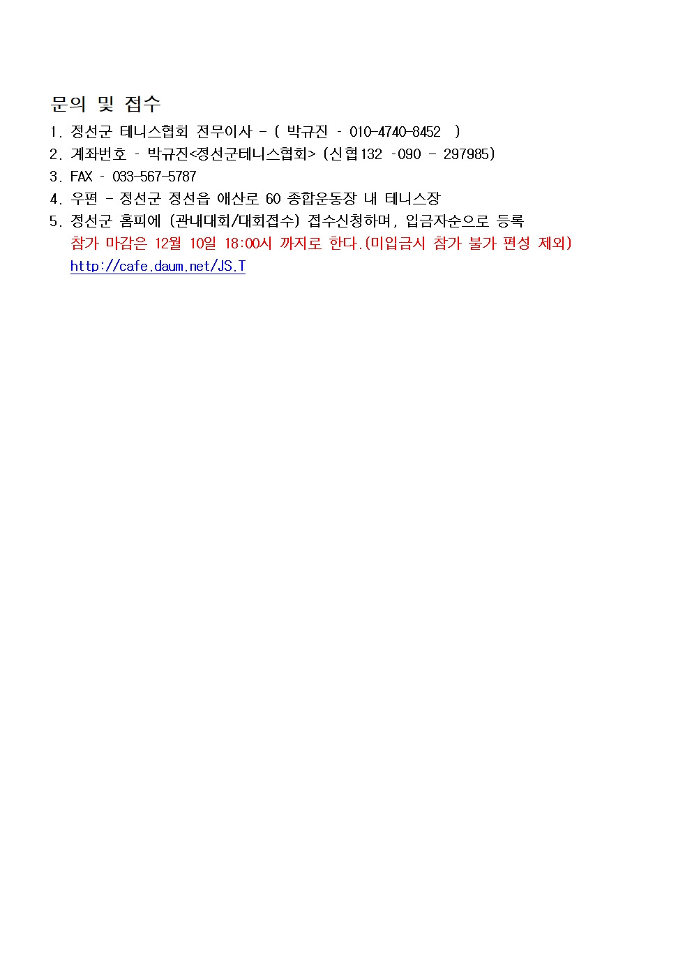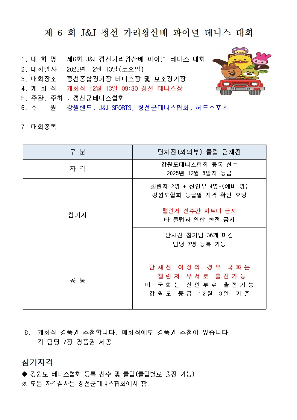 2025년 J&J 정선가리왕산배 테니스대회 단체전 요강임다. 작성자(박규진)푸하하^^규진~~|작성시간25.11.12|조회수586 목록 댓글 1 글자크기 작게가 글자크기 크게가 다음검색 현재 게시글 추가 기능 열기 북마크 공유하기 신고 센터로 신고 댓글 댓글 1 댓글쓰기 답글쓰기 댓글 리스트 작성자(박규진)푸하하^^규진~~ 작성자 본인 여부 작성자 | 작성시간 25.11.12 단체전 1부서만 합니다 신인 4명 챌린저 2 명 댓글 전체보기