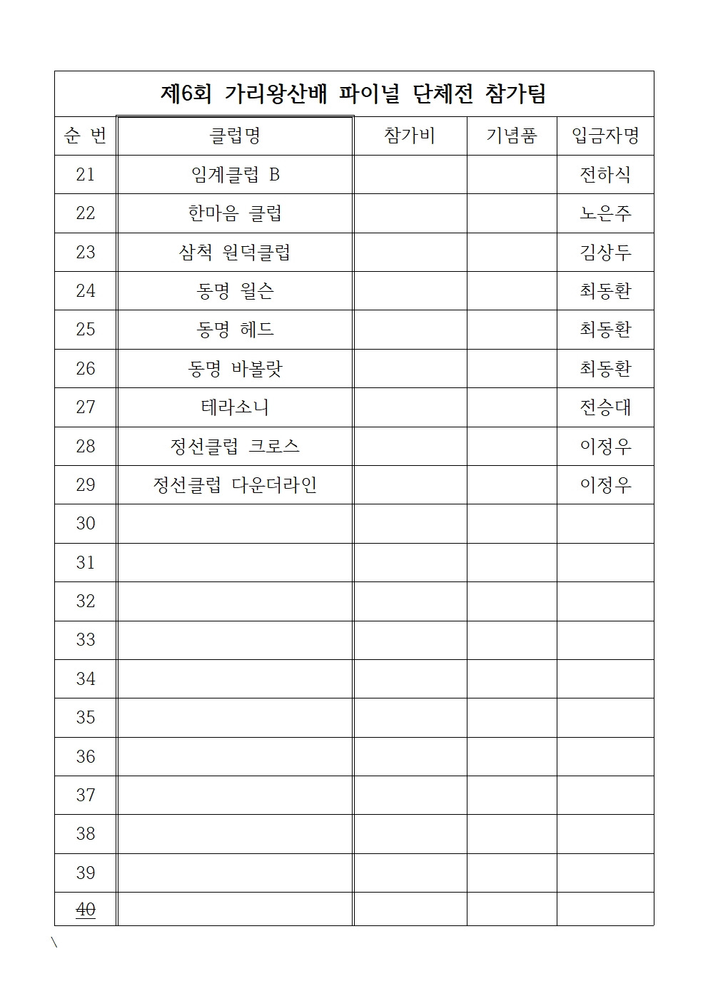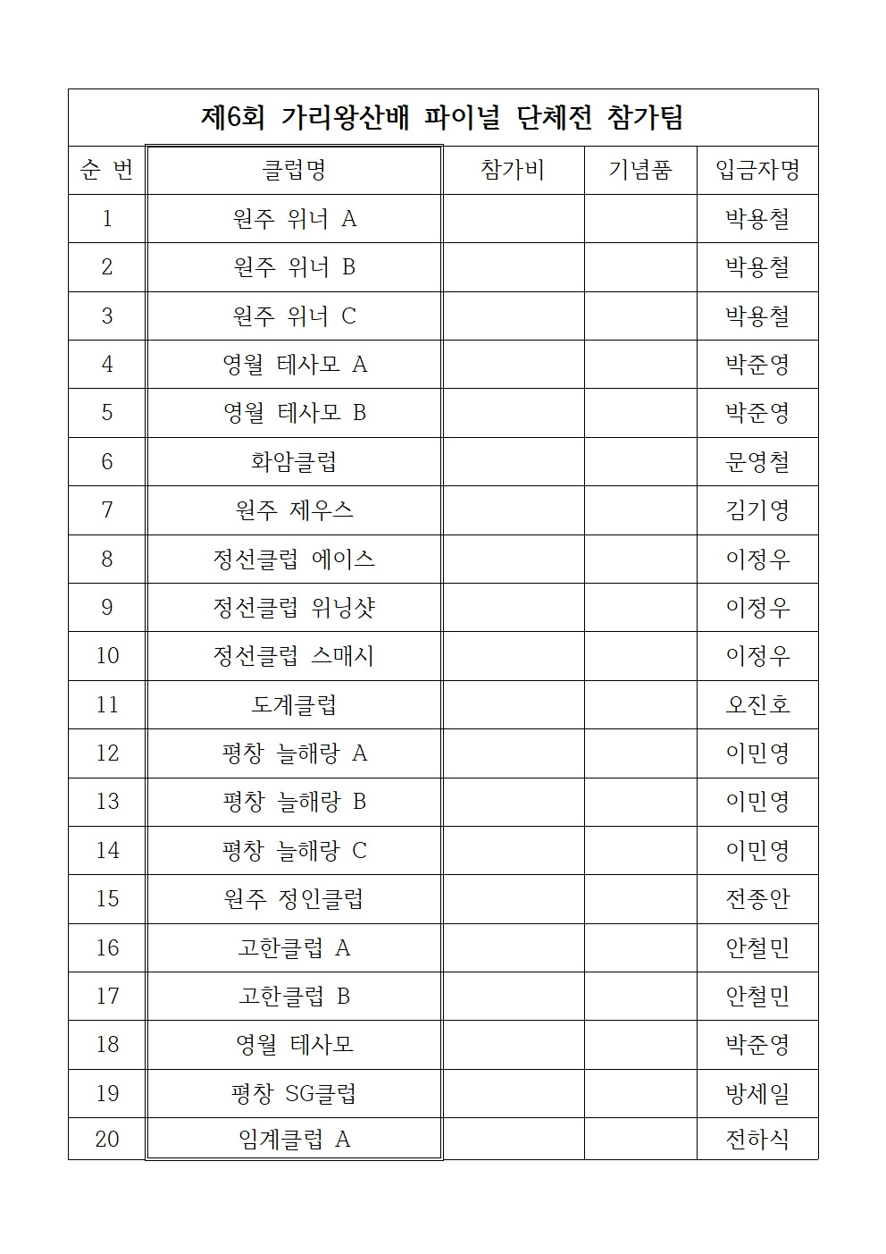 제6회 J&J 정선가리왕산배 파이널 테니스 대회 신청 현황 작성자(박규진)푸하하^^규진~~|작성시간25.12.11|조회수242 목록 댓글 1 글자크기 작게가 글자크기 크게가 파이널 대회 참가 현황입니다. 다음검색 현재 게시글 추가 기능 열기 북마크 공유하기 신고 센터로 신고 댓글 댓글 1 댓글쓰기 답글쓰기 댓글 리스트 작성자박준영 | 작성시간 25.12.11 영월테사모A,B 취소입니다. 영월테사모 한팀만 출전합니다. 댓글 전체보기