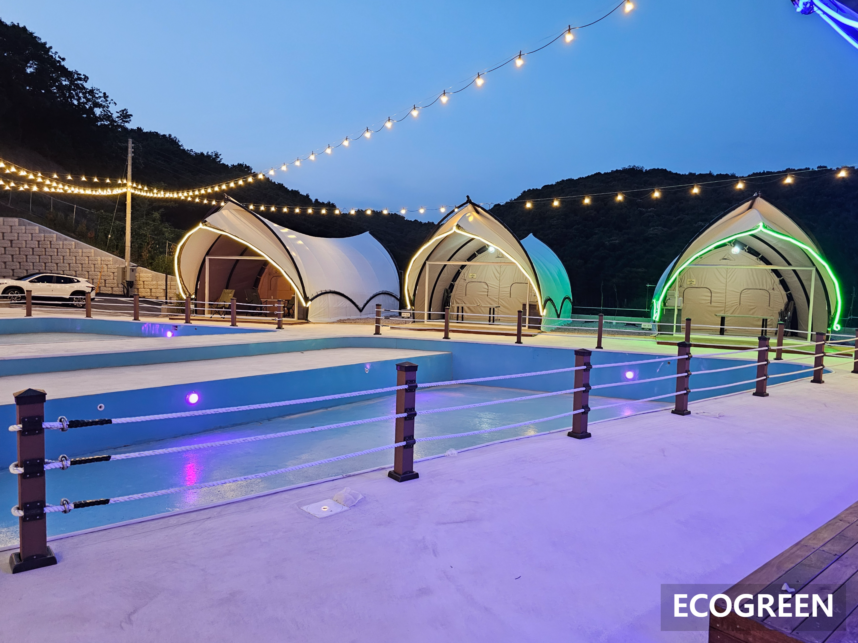 글램핑장의 분위기와 로프휀스가 어우러져 밤에는 더욱 아름다움을 연출합니다.
