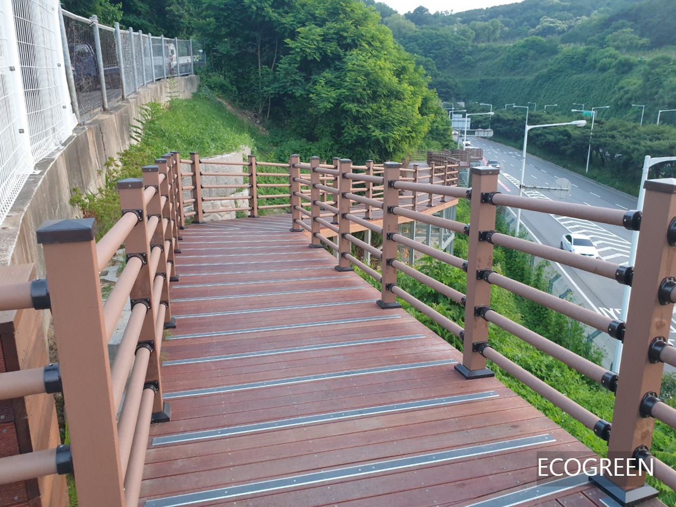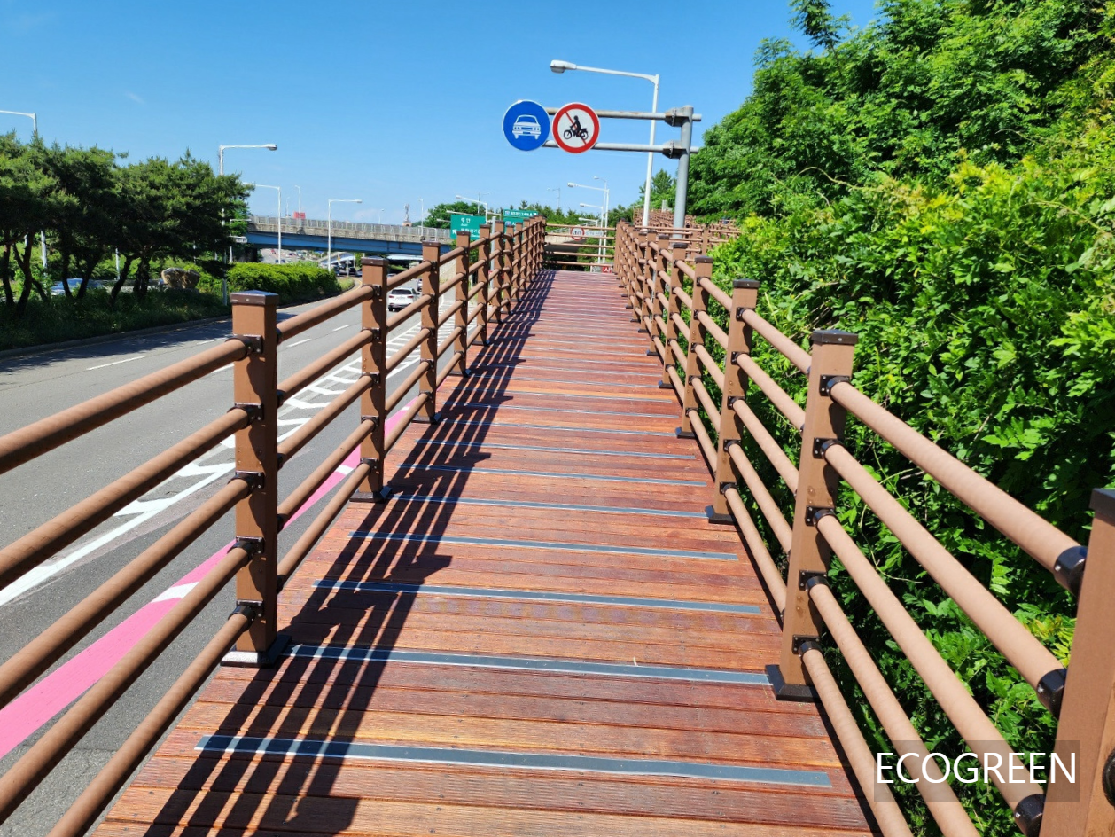 인천 미추홀구 도로 옆 보행자들이 이용하는 경사로에 원형 핸드레일 수평 5줄 합성목재 휀스를 시공했습니다.