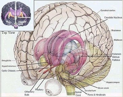 | Hypothalamus, Pituitary Gland | beneath thalamus | regulates basic biological drives, hormonal levels, sexual behavior, and controls autonomic functions such as hunger, thirst, and body temperature. |