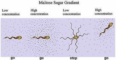 Some of the most basic features of brains can be found in bacteria because even the simplest motile organisms must solve the problem of locating resources and avoiding toxins. They sense their environment through a large number of receptors, which are protein molecules embedded in the cell wall. The action taken in response to the inputs usually depends on the gradient of the chemicals (see Figure 03a). Thus memory is required to compare the inputs from different locations. The strength of the signal is modulated by immediate past experience. This in turn regulates the strength of the signal sent by chemical messengers from
