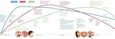* A sense of self develops as the parietal and frontal lobe circuits become more integrated. * Development of voluntary movement, reasoning, and perception * Frontal lobes become active leading to the development of emotions, attachments, planning, working memory and attention * Life experiences shape the emotional well-being in adulthood * At age 6, the brain is 95% of its adult weight and at its peak of energy consumption |