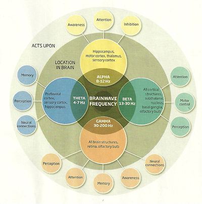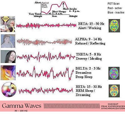 be associated with creative, insightful thought. When an artist or scientist has the "aha" experience, there's a good chance he or she is in Alpha or Theta. These two kinds of brain waves are also associated with relaxation and, stronger immune systems. Therefore, many people try to train themselves to enter such states through various biofeedback7 techniques (with varying degree of success). Delta Waves occur during sleep. They originate from the cerebral cortex when it is not being activated by the reticular formation. In slow-wave sleep, the entire brain oscillates in a gentle rhythm quite unlike the fragmented oscillations of normal consciousness. The neocortical activity is often modulated by a rhythm of 40-80 Hz, called the Gamma wave (not shown in Figure 03g). When there are strong gamma oscillations in certain parts of the neocortex, human subjects do better on learning and memory tasks. A 2010 study indicates that brainwaves are for integrating various sensations to ensure all the relevant signals