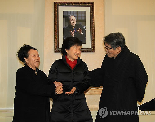 ▲(홍천=연합뉴스) 새누리당 박근혜 대선후보가 13일 강원도 원주시 흥업면 매지리 토지문화관을 방문, 김지하 시인, 부인 김영주 토지문화관장과 대화를 나누고 있다.
