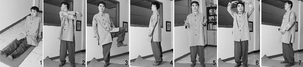 양다리를 뻗은 채 앉은 다음 상체를 비스듬히 뒤로 젖혀 양팔로 지탱한다. 이 자세에서 발뒤꿈치를 붙인 채 양발끝을 빠른 속도로 벌렸다 오므렸다 하며 양발을 부딪친다. 이때 무릎은 반드시 쭉 펴야 한다. 이 동작은 하체의 기혈 순환을 돕고 상기된 기운을 내려 두통을 해소한다.
