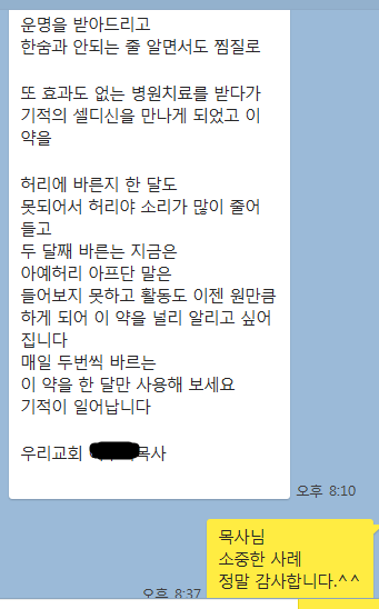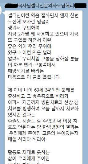 아래 내용은 지방에 계신 목사님께서 허리통증으로 고생하시던 사모님이 한방온열크림 "셀디신" 을 사용 후 허리통증이 사라진 후 보내주신 감사의 메시지 입니다. 셀디신이란 약을 접하면서 왠지 한번도전해 보자란 믿음이 생겨서 구입하여지금 2개월 째 사용하고 있으며 지금 또 구입을 하면서 이런좋은 약이 우리 주위에있구나 이런 약을 널리 알려서 우리처럼 고통을 당하심 분들이 하루 빨리 고통속에서 해방되기를 바라는 마음으로 이 글을 올립니다 제 아내 나이 63세 34년 전 둘째를 출산하고 그 휴우증으로 허리가 아파서 지금까지 병원치료와 한방 침치료를 병행하여 오늘 날까지 치료하였지만 결과는 수술도 시술도 할 수없고 더 이상 치료도 안된다는 양 한방병원의 결과는 우리에게 주어진 고통의 복이였는지 매일 허리야 허리야 활동도 제대로 못하는 삶이 우리에게 주어진 운명을 받아드리고 한숨과 안되는 줄 알면서도 찜질로 또 효과도 없는 병원치료를 받다가 기적의 셀디신을 만나게 되었고 이 약을 허리에 바른지 한 달도 못되어서 허리야 소리가 많이 줄어 들고 두 달째 바른는 지금은 아예허리 아프단 말은들어보지 못하고 활동도 이젠 원만큼 하게 되어 이 약을 널리 알리고 싶어집니다 매일 두번씩 바르는 이 약을 한 달만 사용해 보세요 기적이 일어납니다 **교회 *** 목사 국내유통, 해외수출및 유통 하실 분..찾습니다. 인터넷 "koyoon2000" 을 검색하시면 셀디신에 대한 더 많은 내용을 보실 수 있습니다. "한방온열통증크림 "셀디신" 소개합니다." 16가지 약초를 1년동안 숙성 발효하여 체내흡수력을 높이고 뜸과 찜질 등의 원리를 응용, * 셀디신 소개