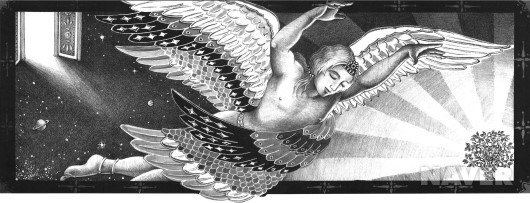 '날개 달린 천사 라파엘은 임무를 받자마자 지체없이 찬란한 날개로 몸을 감싸고 함께 서 있던 무수히 많은 불꽃 천사의 무리 가운데서 시원하고 씩씩하게 솟아올라 하늘을 가로지르며 날아갔다. 천사의 합창대는 재빨리 좌우로 갈라지며 하늘을 쏜살같이 날아가는 그를 방해하지 않으려는 듯 길을 열어주었다. 마침내 하늘 문에 이르자, 지고한 건축가의 성스러운 작업에 의해 만들어진 대로 황금 돌쩌귀가 회전하며 저절로 크게 열렸다.'(『실낙원』)