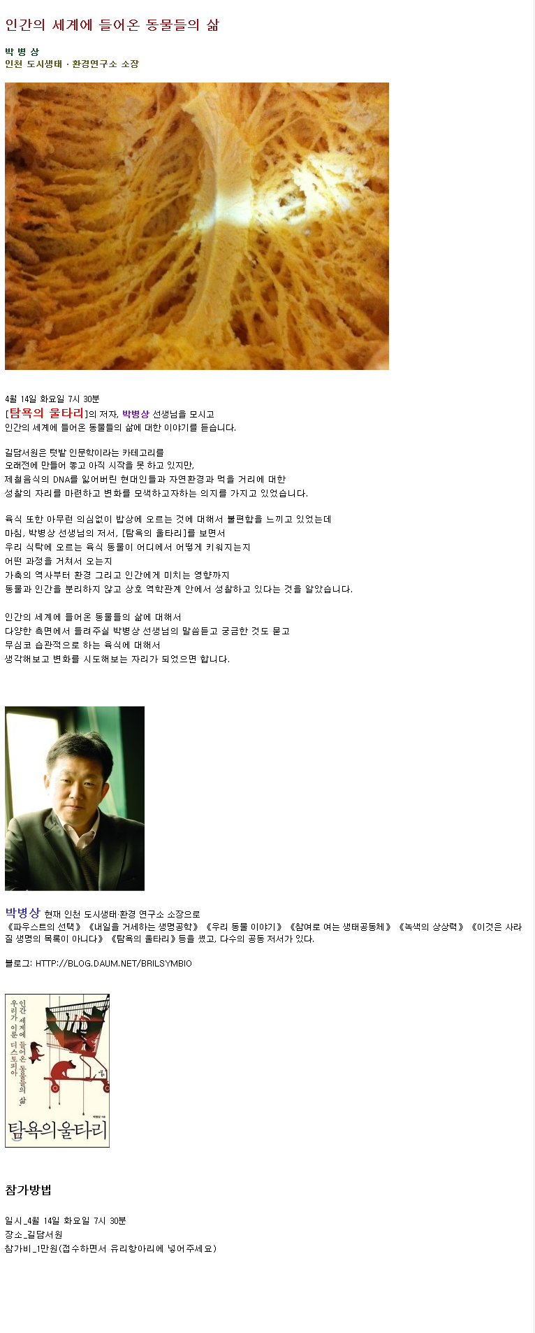 [스크랩] [특강 4/14(화)7시30분]인간의 세계에 들어온 동물들의 삶_박병상 작성자피터|작성시간15.04.09|조회수38 목록 댓글 0 글자크기 작게가 글자크기 크게가 다음검색 스크랩 원문 : 문학과 철학의 향연 현재 게시글 추가 기능 열기 북마크 공유하기 신고 센터로 신고 댓글 댓글 0 댓글쓰기 답글쓰기 댓글 리스트