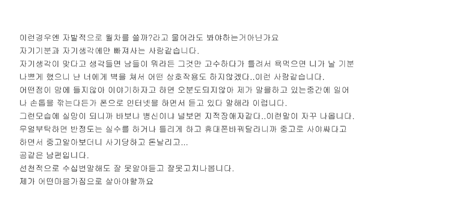 사족) 매우 암울하게도 위 남편께선 아내에 대한 일종의 안쓰러운 저항 혹은 일말의 탈출구로서 그리고 극을 당하는 자신의 수기의 삐뚤어진 표출로써 바람을 필 가능성도 농후하다 봅니다. 매우 안타깝게도!! ㅜ ㅜ