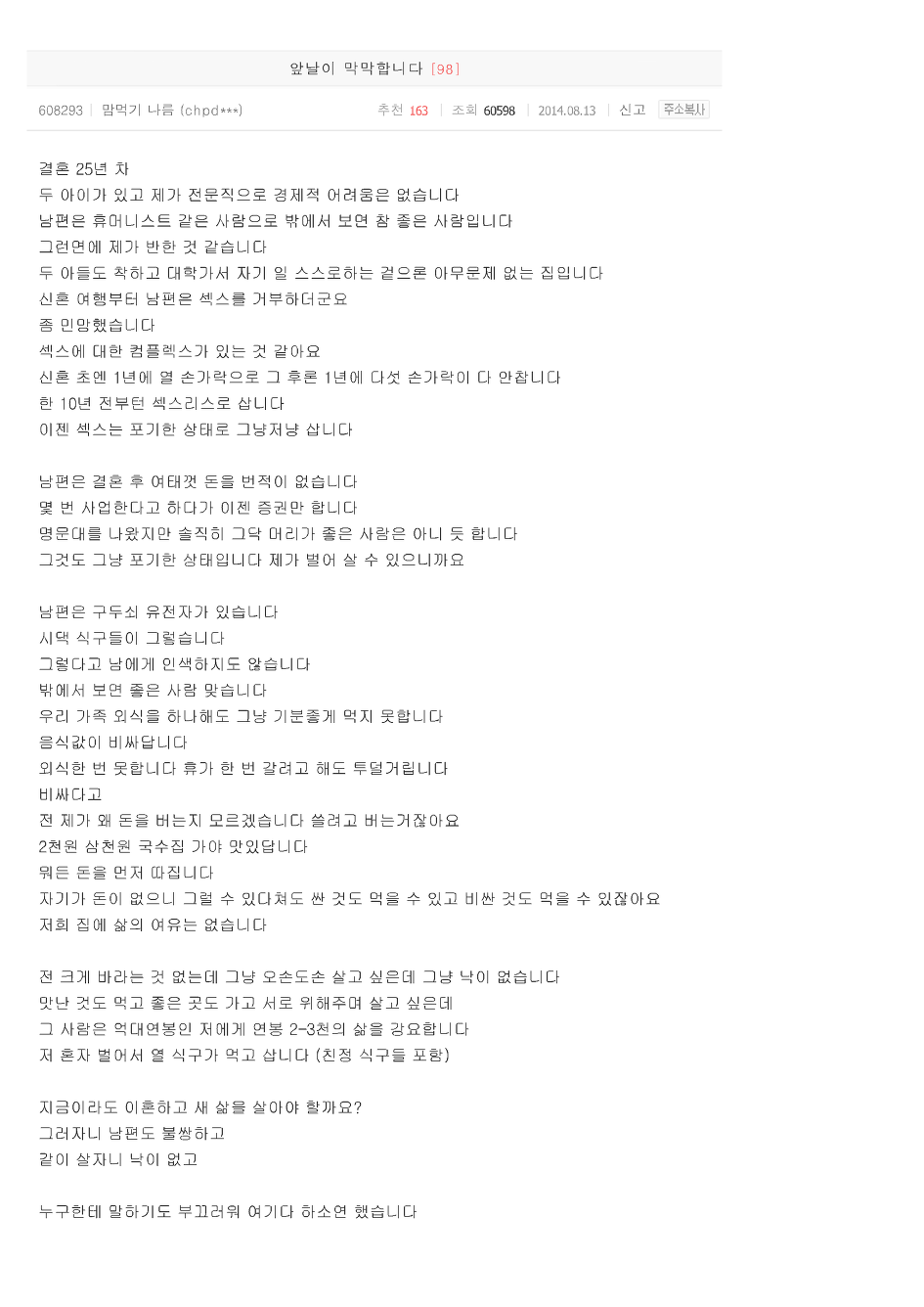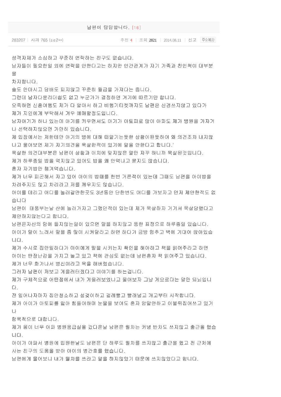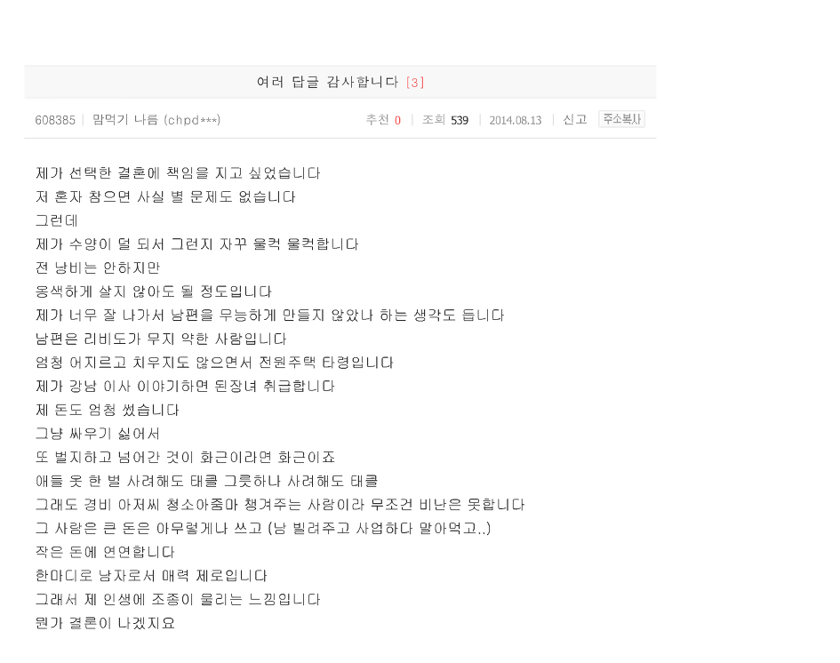 아마도 위 여성분은 이혼하기가 대단히 힘들지 않을까 싶네요! 아내 스스로 남편을 향한 족쇄를 자기 자신에게 채움!! ㅜ ㅜ