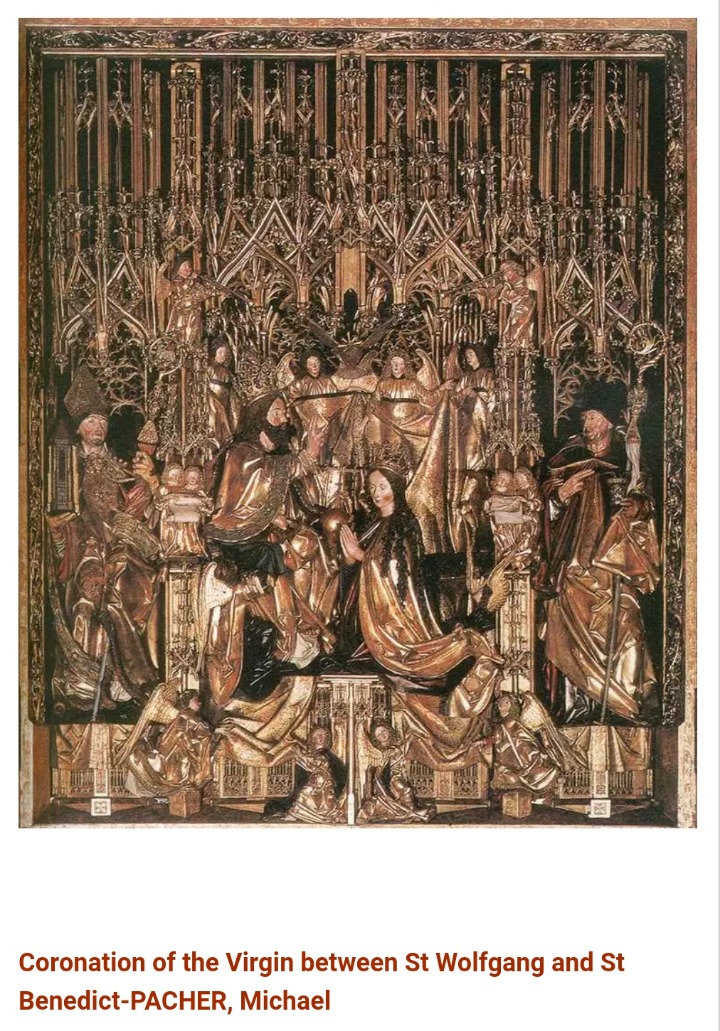 △ Coronation of the Virgin between St Wolfgang and St Benedict-PACHER, Michael
