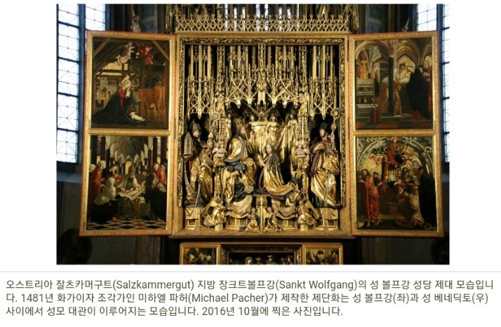 1481년 화가이자 조각가인 미하엘 파허(Michael Pacher)는 성 볼프강과 성 베네딕투스 사이에서 성모 대관이 이루어지는 제단화를 제작했다.