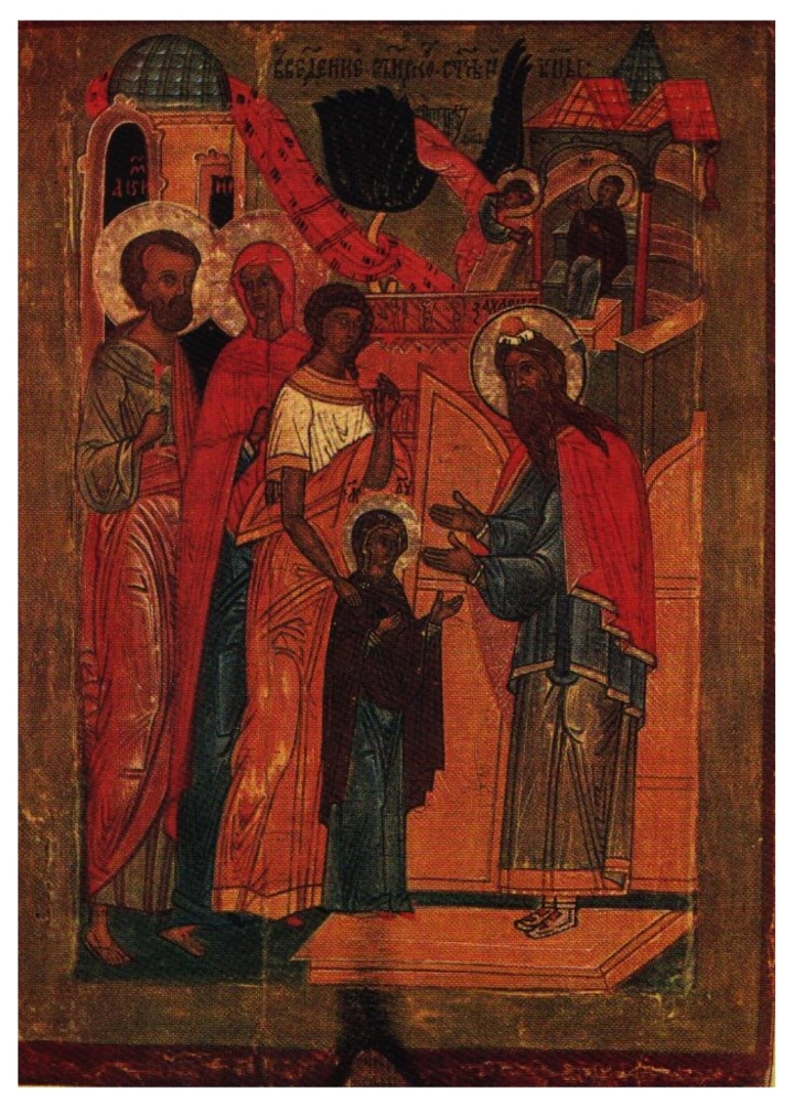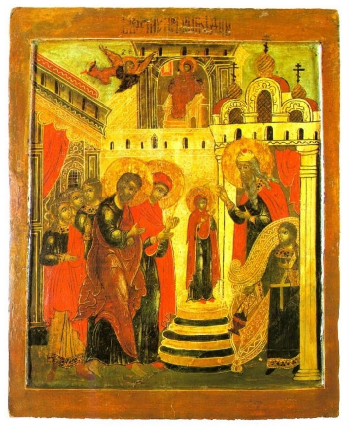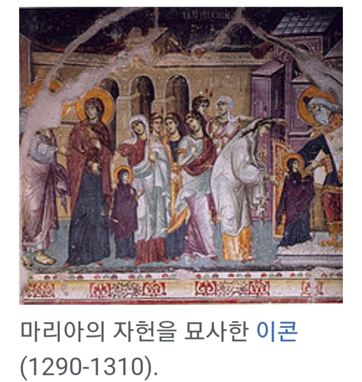 이야기에 따르면 마리아는 3살 때 예루살렘성전에 봉헌되어 다른 소녀들과 함께 거룩한 교육을 받았다.
