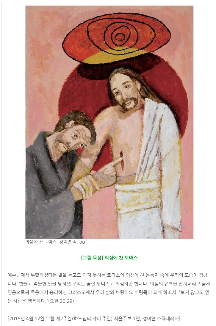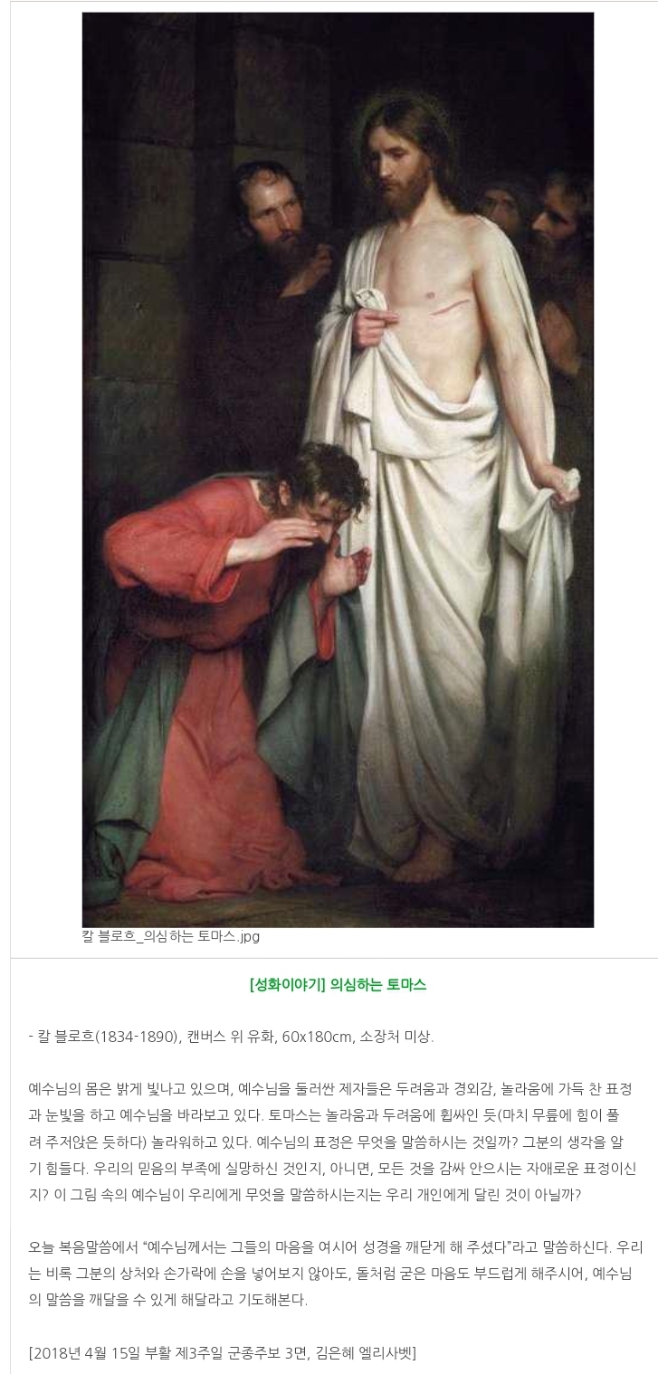 우리는 토마스 사도처럼 예수님을 직접 만져 보는 특권을 누릴 수는 없지만 신앙의 눈으로 본다면 의심의 껍질을 벗어버릴 수 있다.