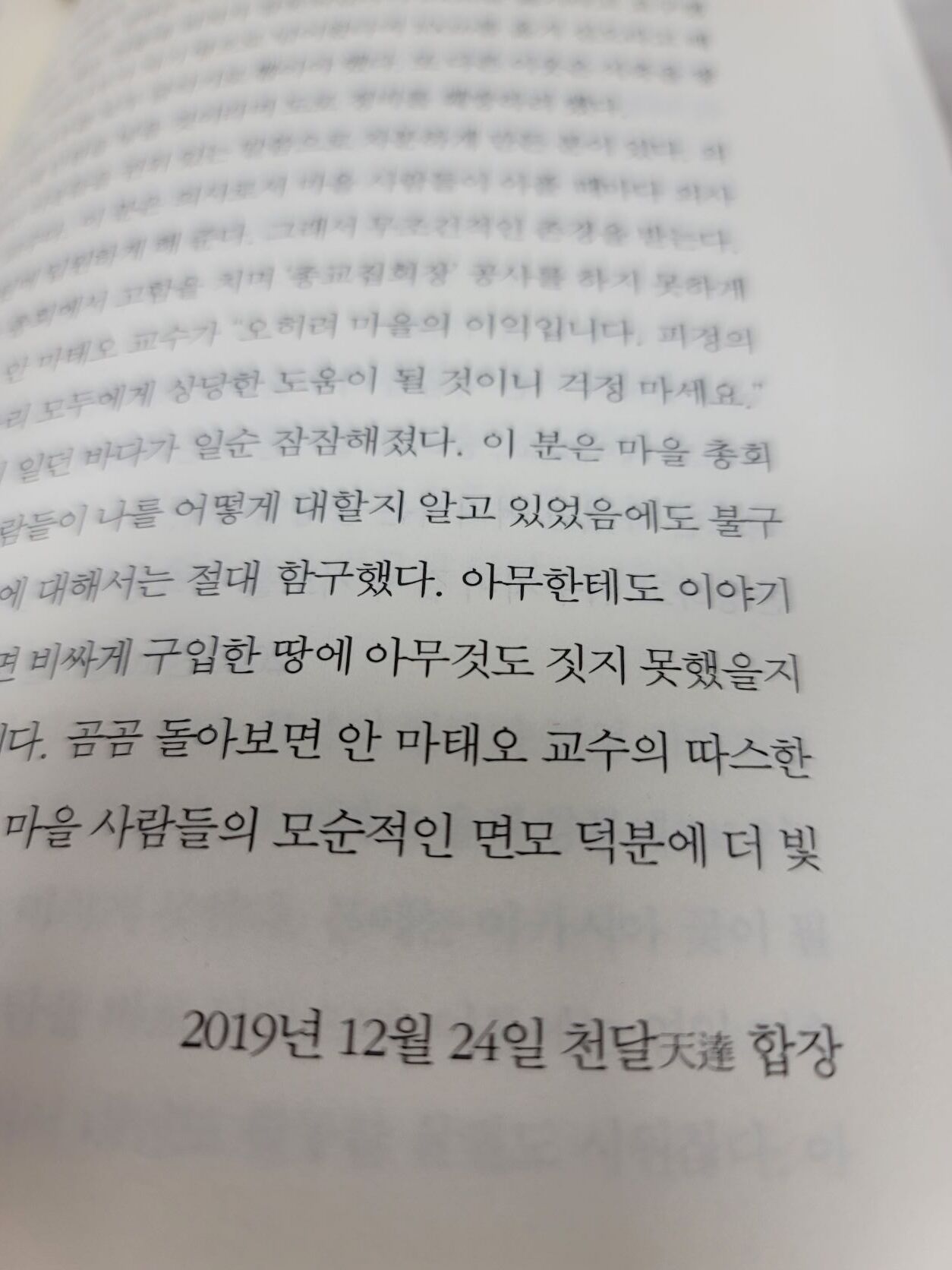 “곰곰 돌아보면 안 마태오 교수의 따스한 심성과 존재감은 공사를 방해한 마을 사람들의 모순적인 면모 덕분에 더 빛나는 것이 아닌가 한다.”(171면)