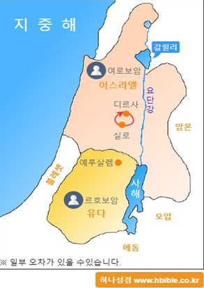 이스라엘 왕정국가는 통일왕국과 분열왕국으로 나눌 수 있습니다. 사울, 다윗, 솔로몬시대를 통일왕국으로 보며, 솔로몬시대 이후 왕국이 북과 남으로 나누어지게 됩니다. 북을 이스라엘이라 부르고, 남을 유다라고 부릅니다. 북이스라엘 초대 왕은 여로보암이고, 남유다의 초대왕은 르호보암입니다.