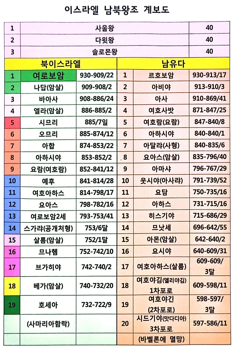 북왕국 이스라엘 초대왕->여로보암->나답->바아사->엘라->시므리->오므리(12년)->아합(22년)->아하시야(2년)->여호람(12년)->예후