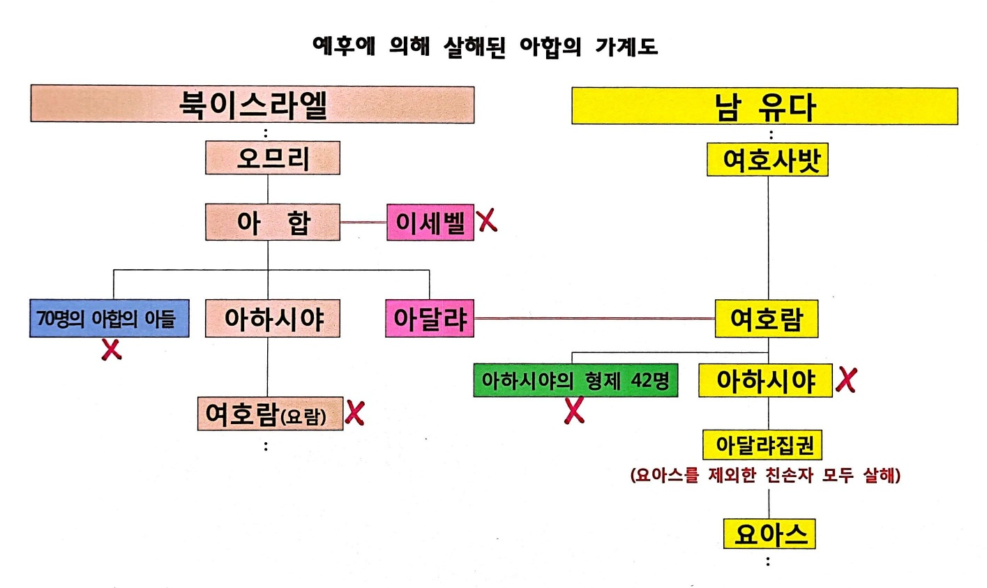 북쪽 이스라엘의 아합王祖가 심판당하는 과정에서 이들과 동맹을 맺은 남쪽 아하시야 왕족들까지 이렇게 우연처럼 멸망을 당합니다. 즉 아합의 피가 흐르는 친가(親家)나 외가(外家)쪽으로나 모두 진멸당한 것입니다. 하나님의 심판이 얼마나 철저하고 세밀한가?