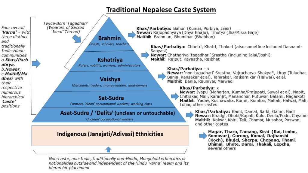 네팔에도 카스트 제도가 있냐고 묻는 이들이 꽤 많은데, 카스트 제도는 네팔을 이해하는 데 있어서 아주 중요하다 . 카스트 제도는 힌두교와 매주 밀접한 관계가 있는 제도로, 80% 이상의 국민이 힌두교를 믿는 네팔에도 카스트 제도가 있다.