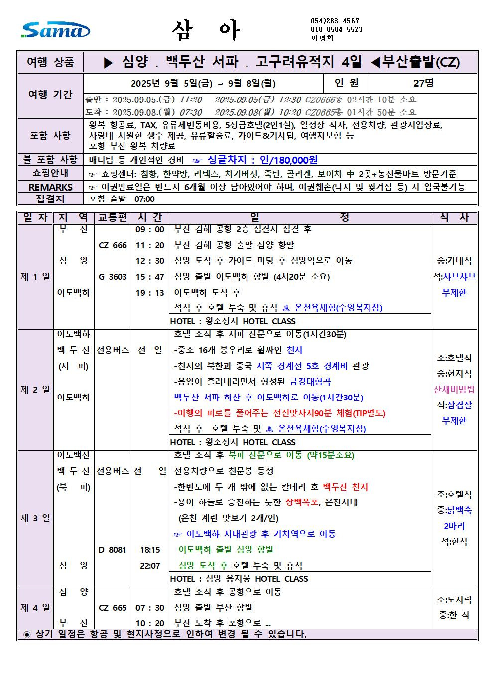 심양, 백두산 북파 서파, 구고려 유적지 4일 작성자청류|작성시간25.08.01|조회수19 목록 댓글 0 글자크기 작게가 글자크기 크게가 * 심양, 백두산(북파+서파), 고구려 유적지* 9월5일(금)~9월8일(월)* 부산공항 출발 ~ 남방항공* 백두산 여행 적극 추천합니다. 다음검색 현재 게시글 추가 기능 열기 북마크 공유하기 신고 센터로 신고 댓글 댓글 0 댓글쓰기 답글쓰기 댓글 리스트