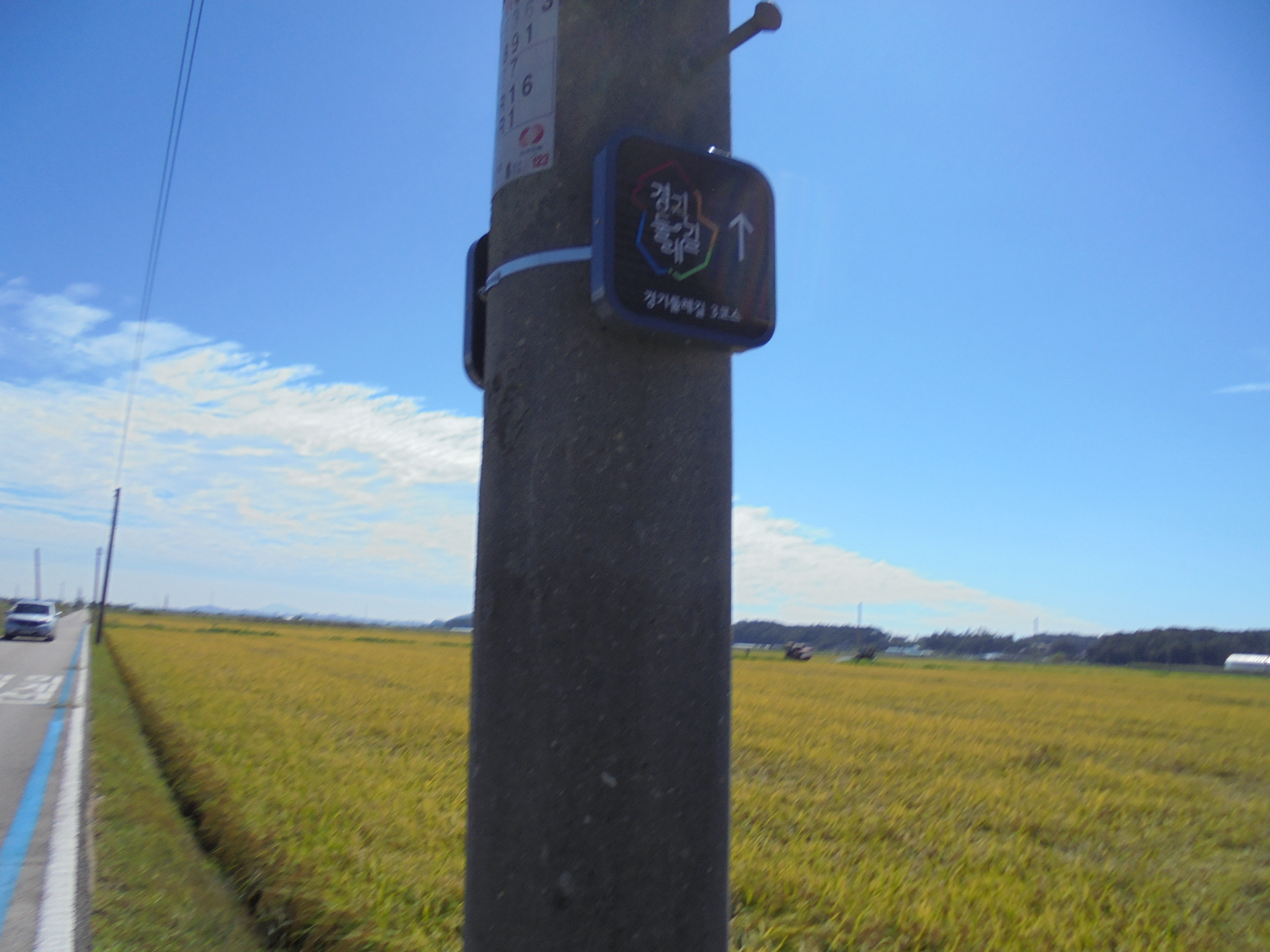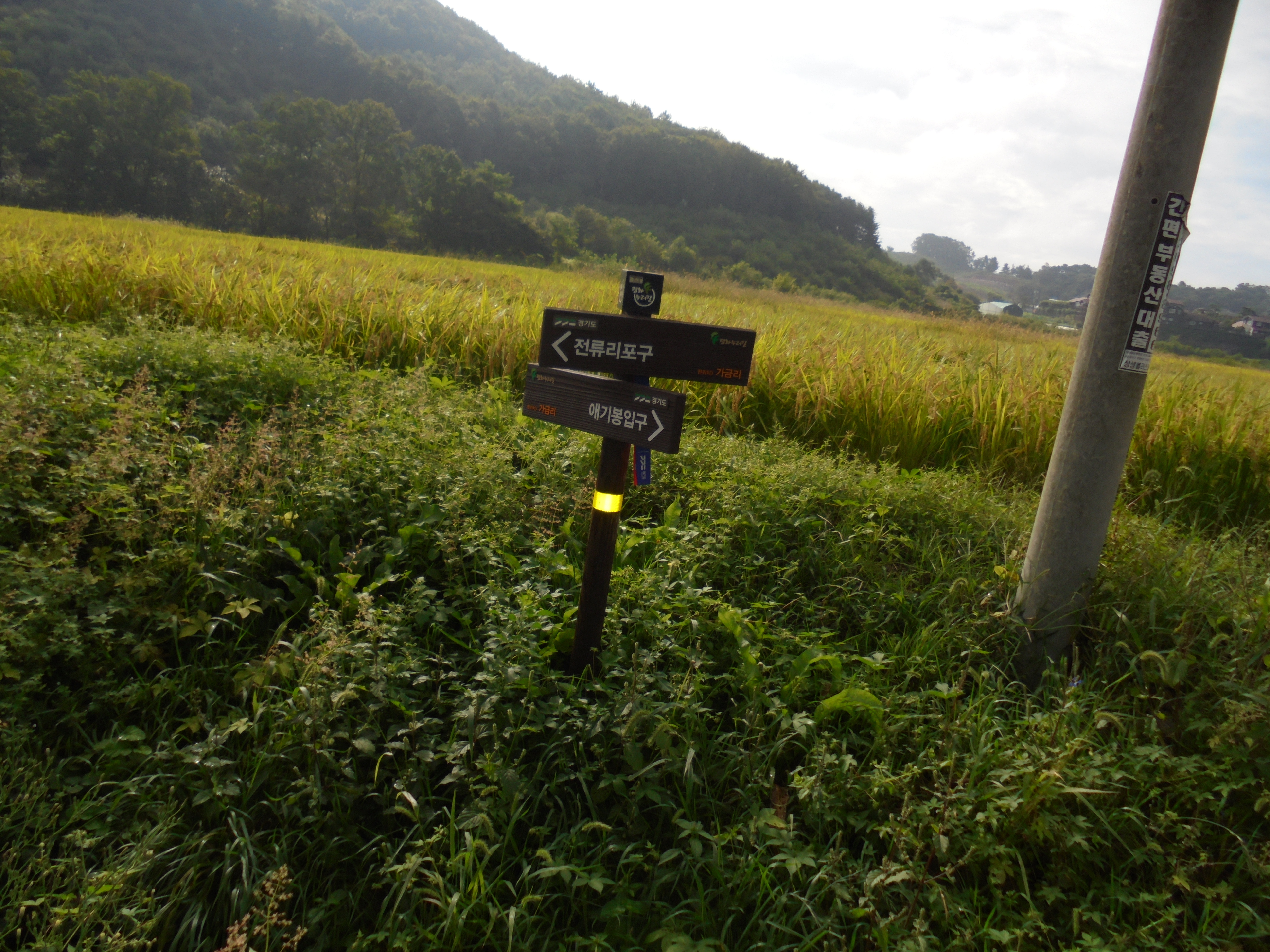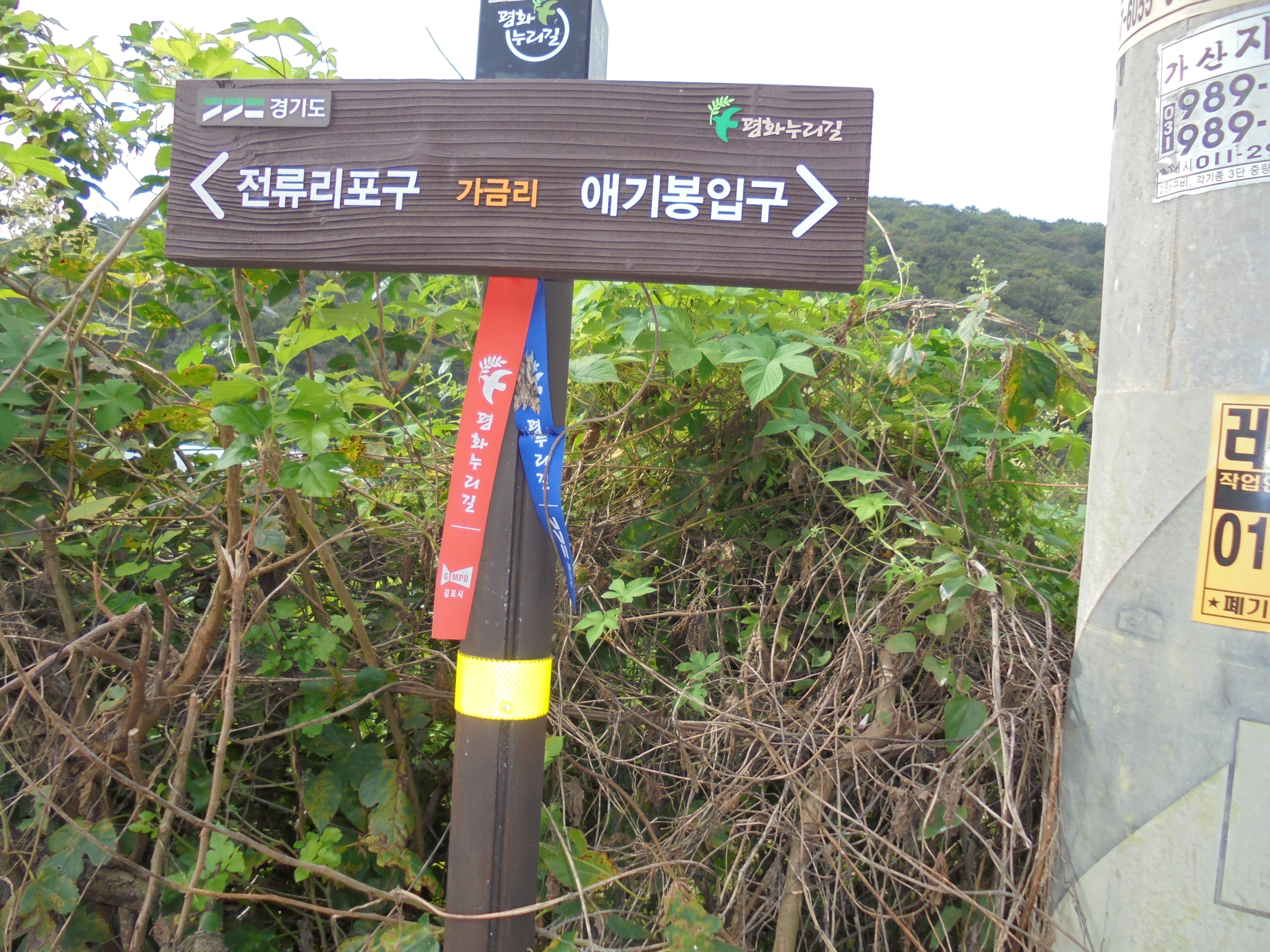 기둥에다 경기둘레길 이정표 표시를 해놓았다.