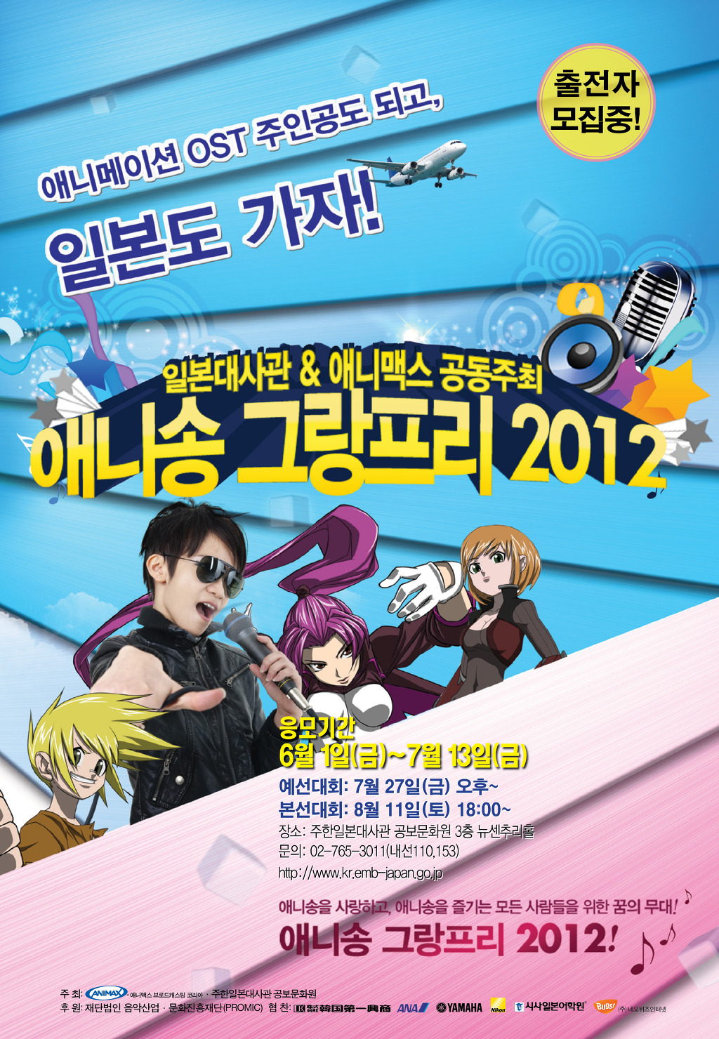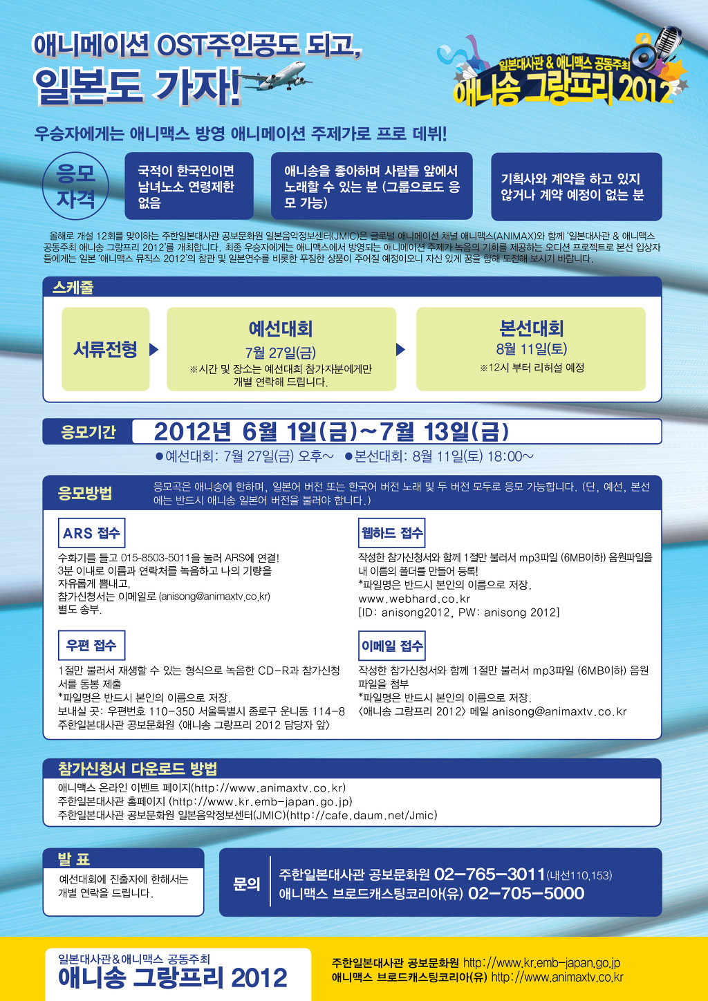 올해로 개설 12회를 맞이하는 주한일본대사관 공보문화원 일본음악정보센터(JMIC)은 글로벌 애니메이션 채널 애니맥스(ANIMAX)와 함께 ‘일본대사관 &애니맥스 공동주최 애니송 그랑프리 2012’를 개최합니다. 우승자에게는애니맥스에서 방영되는 애니메이션주제가녹음의기회를제공하는 오디션 프로젝트로 본선 입상자들에게는 일본 ‘애니맥스뮤직스 2012’의 참관 및 일본연수를 비롯한 푸짐한 상품이 주어질 예정이오니 자신 있게 꿈을 향해 도전해 보시기 바랍니다.