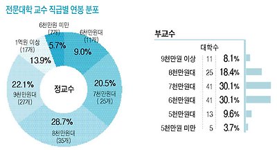 전문대학 정교수 평균연봉은 2010년 이래 3년째 동남보건대학이 가장 많았다. 배화여자대학이 2년 만에 부교수와 조교수 평균연봉 1위 자리를 되찾았다. 전임강사 평균연봉은 인덕대학이 가장 많았다. 전문대학 교수 연봉은 지역적 격차가 두드러져 수도권 전문대학의 정교수가 비수도권 대학 정교수보다 평균 1천451만원을 더 받았다. 수도권 전문대학의 정교수 평균연봉은 4년제 대학보다도 높은 것으로 나타났다.