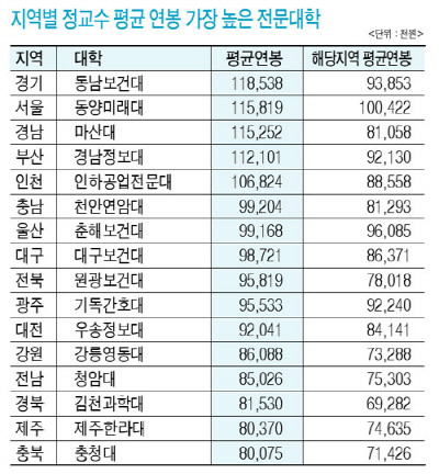 수도권 전문대학의 정교수 평균연봉은 4년제 대학보다 높다. 인천지역 전문대학은 같은 지역 4년제 대학보다 정교수 평균연봉이 1천187만원 높았다. 같은 지역 4년제 대학 교수보다 서울지역 전문대학 교수는 326만원, 경기지역 전문대학 교수는 245만원을 더 받았다. 광주와 전남지역도 전문대학이 4년제 대학보다 정교수 평균연봉이 각각 1천95만원, 129만원 높았다. 반면 충북지역 전문대학 정교수는 4년제 대학 교수보다 평균 1천683만원을 적게 받았고, 강원지역 전문대학 정교수 평균연봉도 4년제 대학보다 1천659만원 적었다. 울산(1천533만원)과 경북(1천550만원)도 1천500만원 넘게 차이가 벌어졌다.