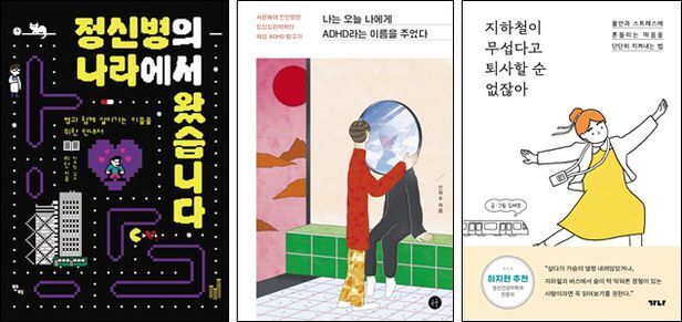 왼쪽부터 ‘정신병의 나라에서 왔습니다’‘나는 오늘 나에게 ADHD라는 이름을 주었다’‘지하철이 무섭다고 퇴사할 순 없잖아’ 책 표지. /민음사·반비·휴머니스트·가나출판사