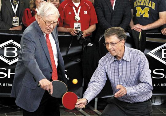 워런 버핏 버크셔 해서웨이 회장이 빌 게이츠 마이크로소프트 창업자와 팀을 이뤄 탁구를 치고 있다. /로이터뉴시스