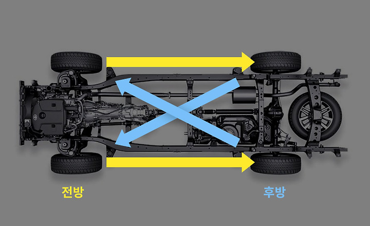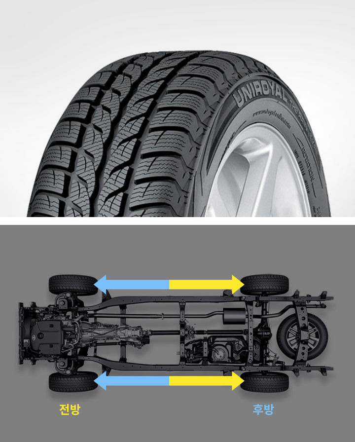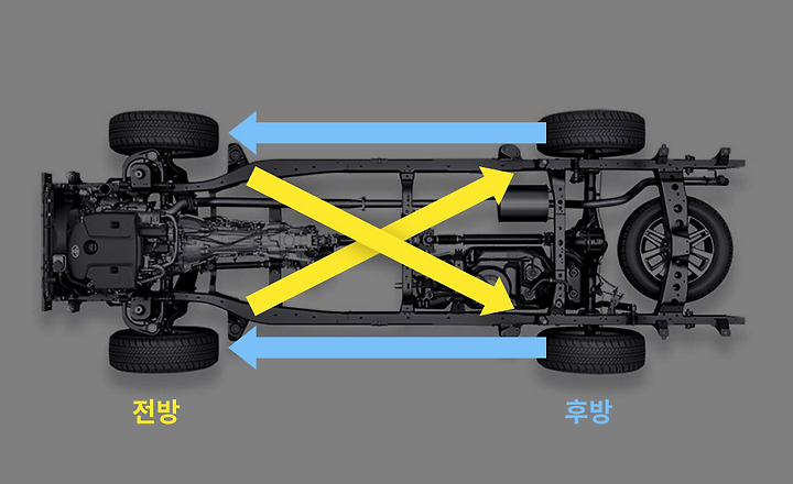 후륜구동, 상시 사륜구동, 사륜구동은 차량의 특성상 비대칭 타이어를 사용하는 경우가 많은데, 이때 타이어 교환은 X자 대각선으로 바꿔주시면 됩니다.