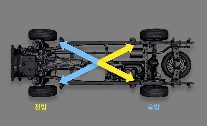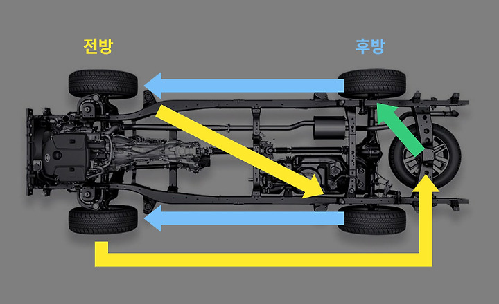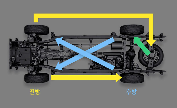 후륜구동이나 사륜구동 차량의 경우 뒤 타이어는 앞으로 이동하고, 피로도가 높은 우측 전방 타이어가 피로도가 가장 낮은 좌측 후방 위치로 이동합니다. 좌측 전방 타이어는 스페어의 자리로 들어가면 되죠.