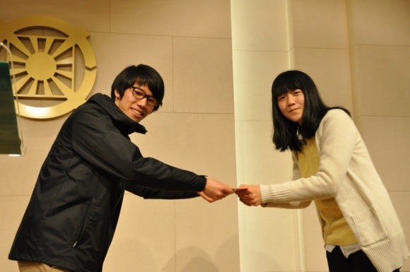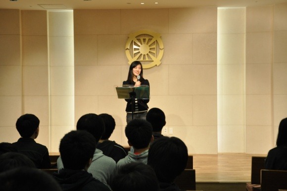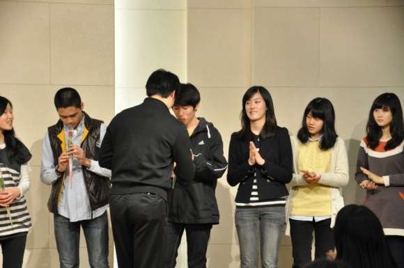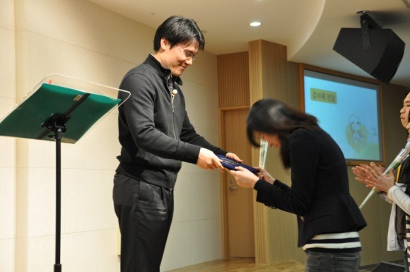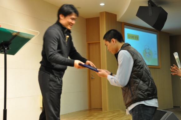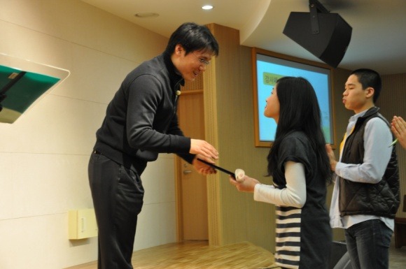 성화의밤 소감문 1등을 한 55회 김부희성화에게 상품을 증정중이신 양지응교사님
