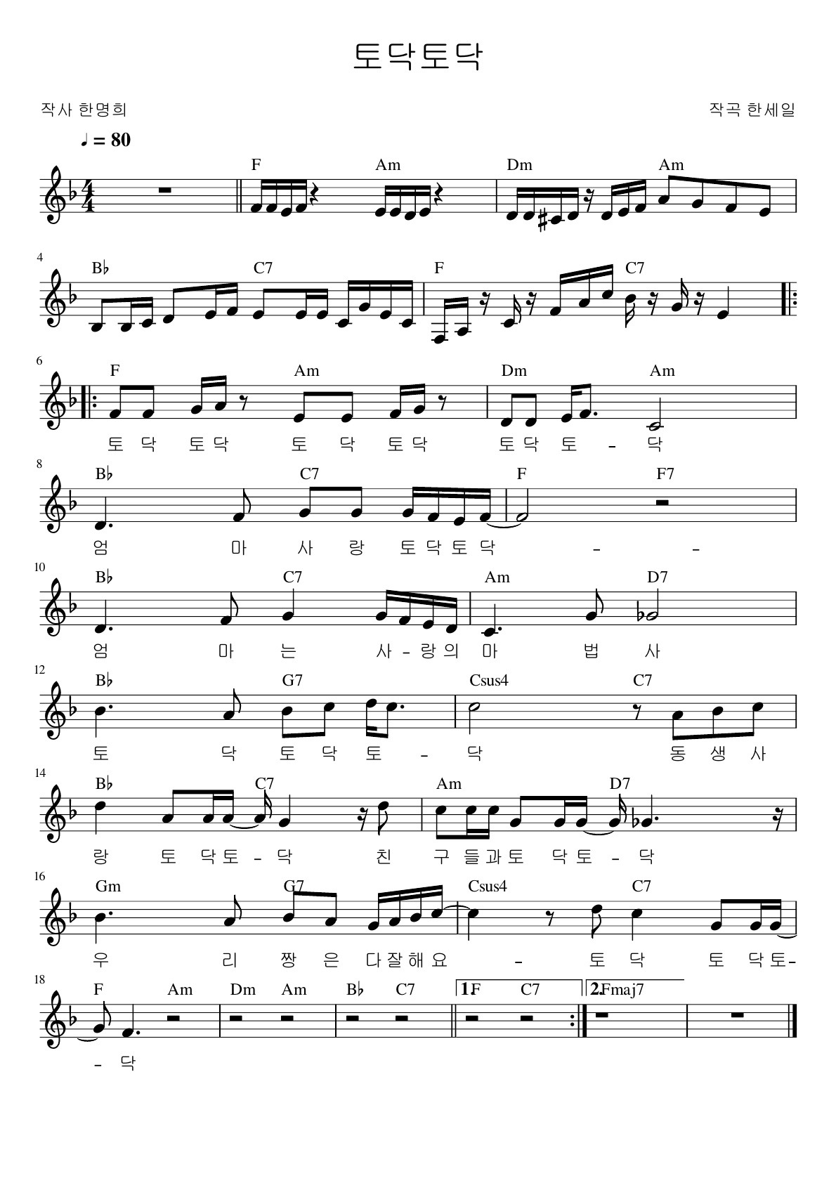 [음원파일][천일국동요23][81]토닥토닥 작성자본부 성29 한세일|작성시간25.08.06|조회수159 목록 댓글 0 글자크기 작게가 글자크기 크게가 유튜브 링크 : https://youtu.be/3Nql7LsxIHQ 토닥토닥(한명희작사,한세일작곡).zip1.69MB토닥토닥MR(한명희작사,한세일작곡).zip1.69MB ※음원관련 문의전화(카톡만 가능) : o l o - 2 l 6 l - 6 o 5 l 첨부파일첨부된 파일이 3개 있습니다. jpg 파일 토닥토닥(코드악보)_1.jpg 다운로드 zip 파일 토닥토닥MR(한명희작사,한세일작곡).zip 다운로드 zip 파일 토닥토닥(한명희작사,한세일작곡).zip 다운로드 다음검색 현재 게시글 추가 기능 열기 북마크 공유하기 신고 센터로 신고 댓글 댓글 0 댓글쓰기 답글쓰기 댓글 리스트
