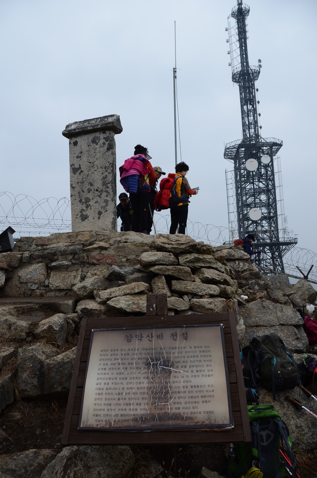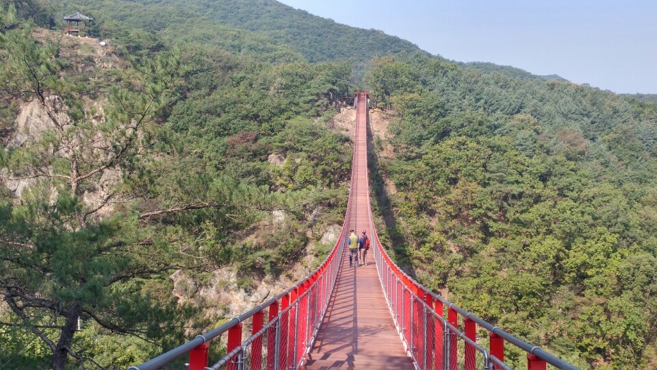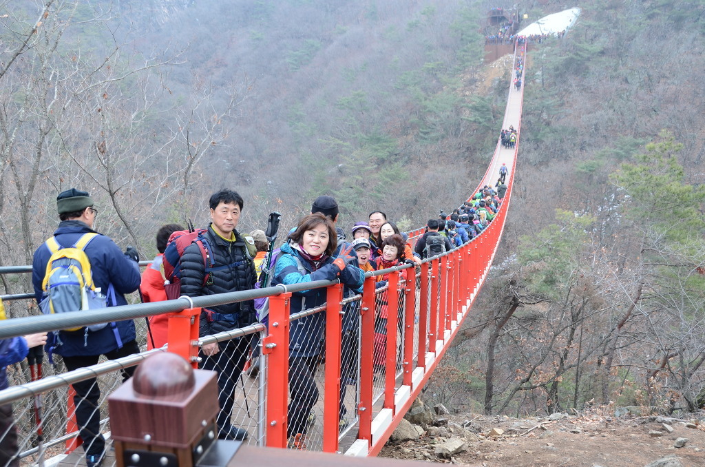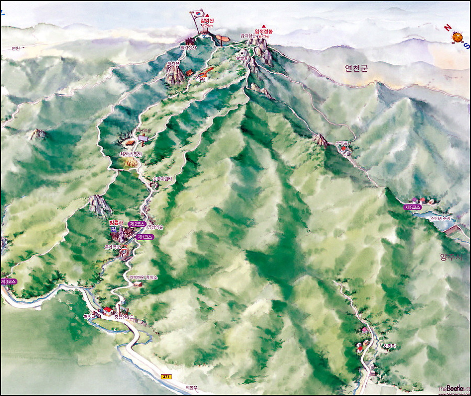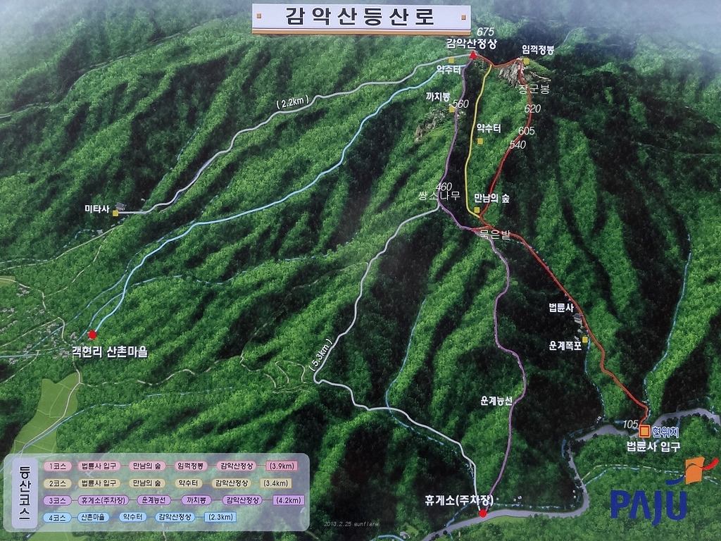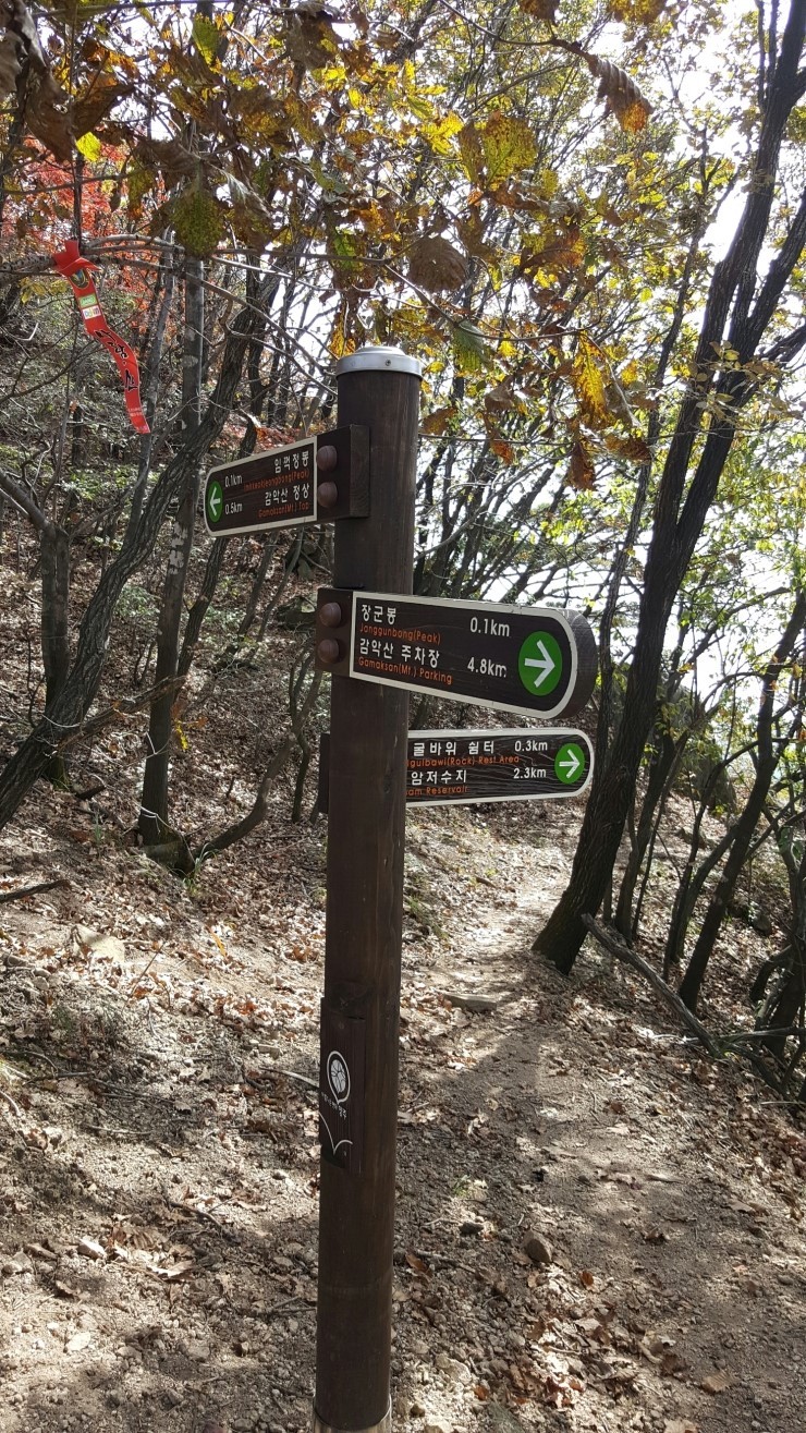 감악산(675m) 감악산(675m)은.경기도 파주군적성면,양주시 남면,연천군 전곡,에걸쳐있는산으로 해발고도 675m 의산이다 바위사이로 검은빛과 푸른빛이 동시에 쏟아져 나온다하여 감악산,또는 감색 바위산이라 불렸다고 한다, 파주 감악산은 가을 단풍이멋진산으로도 알려져있다 장군봉 아래는조선 명종 때 의적 임꺽정이 관군의 추적을 피해 숨어 있었다는 임꺽정굴이 있으며 설마리 계곡에는 6.25전쟁과 관련한 영국군 전적비와 대한의열단 전적비가 있다. 2016년10월22일 우리나라에서가장긴 산악 현수교가 설치되여 또 하나의 볼거리를 선사한다, 예로부터 경기 5악의 하나로서 폭포, 계곡, 암벽 등을 고루 갖추고 있으며,임진강, 개성 송악산 등의 조망이 좋은 점 등을 고려하여 선정수량이 풍부한 운계폭포가 있고, 정상에는 글자가 모두 마멸되어 판독이 불가능한 비뜰대왕비(파주군 향토유적 제8호)가 있는데 설인귀(薛人貴)' 설과 `진흥왕 순수비'설이 나뉘어 속전되고 있다. 임꺽정이 관군의 추격을 피하기 위해 숨어 지냈다는 장군봉 아래 임꺽정 굴이 있다. 산행코스:주차장~ 출렁다리입구~출렁다리~법륜사~장군봉~임꺽정봉~감악산정상 까치봉~쌍소나무~만남의숲~법륜사~출렁다리~주차장~원점(약3시간40분~4시간)