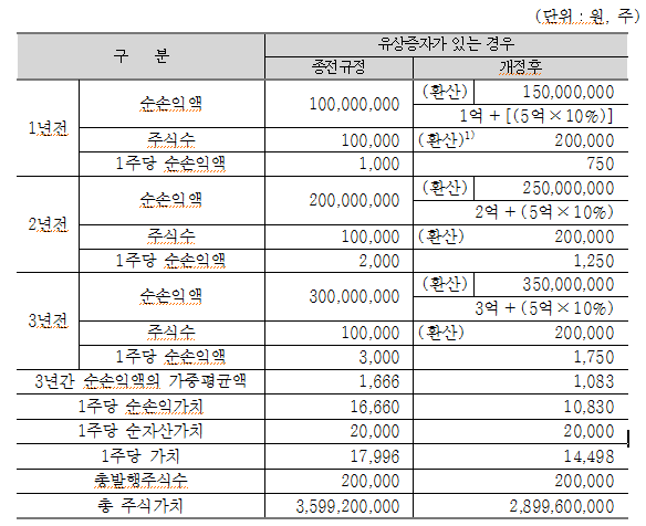 또한, 최근 3년간 당해 법인의 1주당 액면가액을 변경함으로써 총 발행주식수가 달라진 경우에는 최종 사업연도의 총 발행주식수를 기준으로 하여 1주당 순손익액을 계산한다.