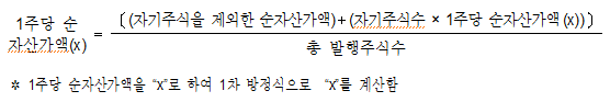 (2)자기주식을 보유한 법인의 비상장주식의 1주당 순자산가액을 계산할 때 당해 법인이 일시적으로 보유한 후 처분할 자기주식은 자산으로 보아 아래 산식에 의해 1주당 순자산가치를 계산한다(서일46014-10200, 2001.9.19).