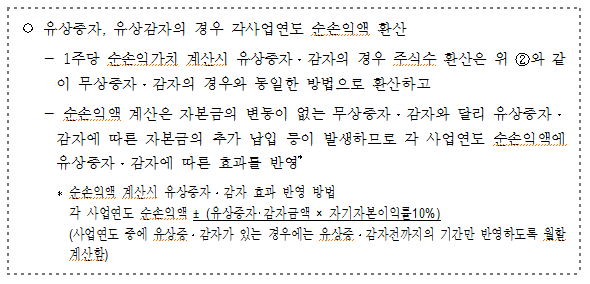 1주당 최근 3년간의 순손익액의 가중평균액을 계산함에 있어 각 사업연도의 주식수는 각 사업연도 종료일 현재의 발행주식총수에 의한다. 다만, 평가기준일이 속하는 사업연도 전 3년 이내에 무상증자 또는 무상감자를 한 사실이 있는 경우에는 무상증자 또는 무상감자 전의 각 사업연도 종료일 현재의 발행주식총수는 다음의 산식에 의하여 환산한 주식수에 의하며, 2011.7.25.이후 상속․증여분부터는 평가기준일이 속하는 사업연도 전 3년 이내에 유상증자 및 유상감자가 있는 경우에도 각 사업연도 종료일 현재 총 발행주식수를 환산하여 적용하고 이 경우 유상증․감자에 따른 효과를 각 사업연도 순손익액에 반영하도록 개정하였다.
